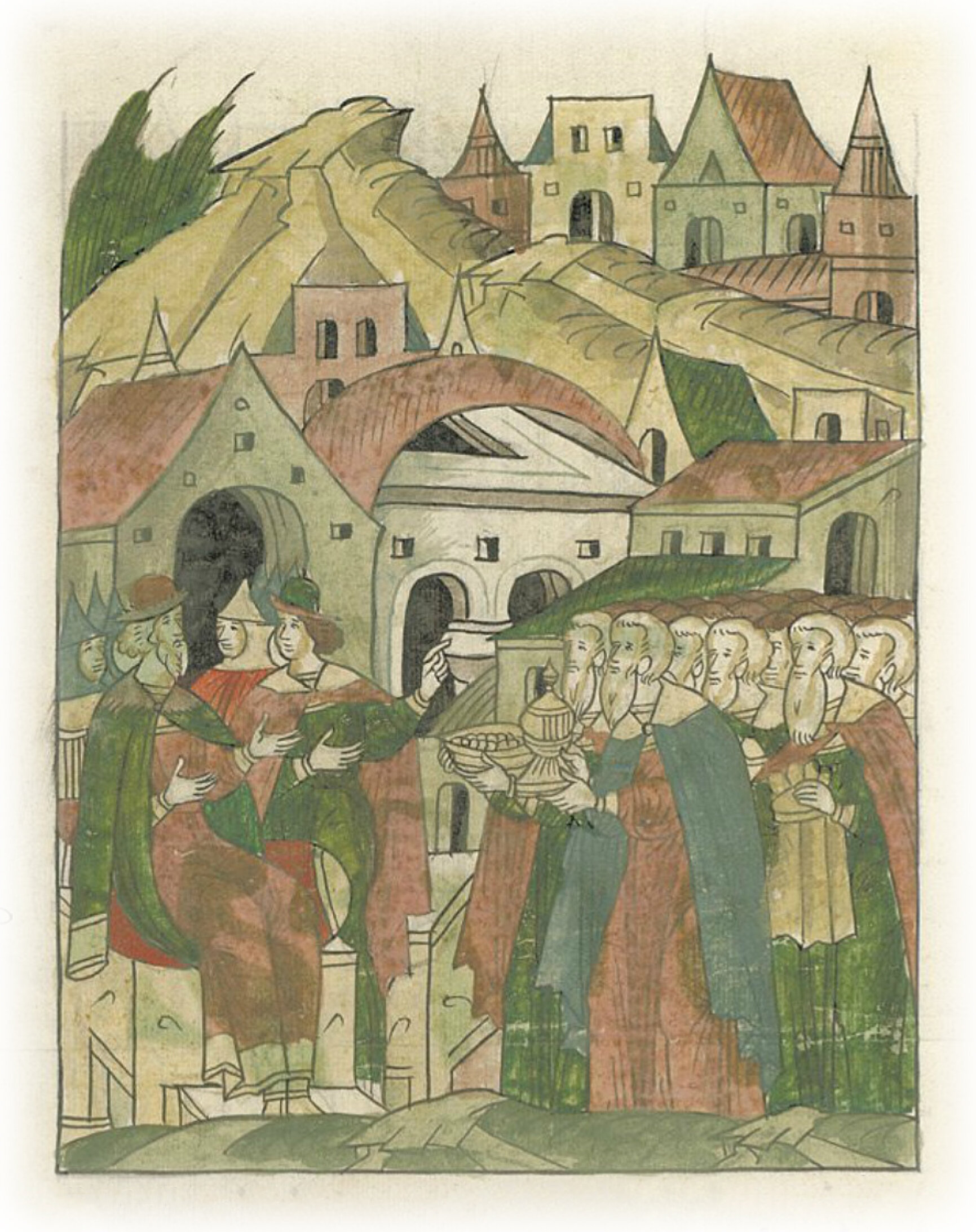 Новгородские бояре, зажиточные горожане и купцы дают великому князю Ивану Васильевичу много подарков.
