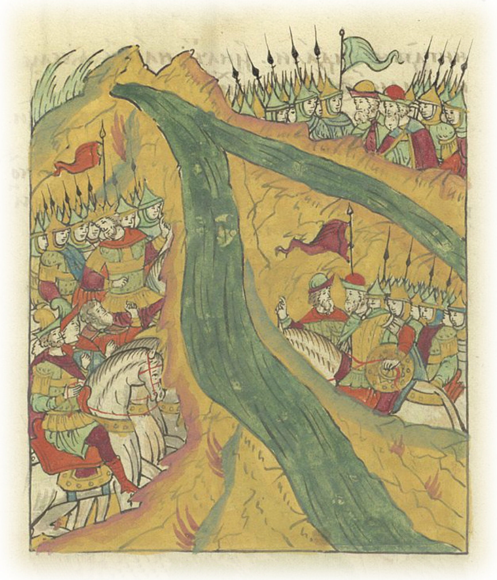 И узрел царь, что идут и сторожевые полки, многие люди; и призвал царь князя Семена Бельского и князей своих: «Сказали мне, что великого князя люди к Казани пошли, а мне и встречи не будет; а мне так много людей снаряженных, ни кутазников*, ни аргамачников** не приходилось видеть в одном месте. А старые мои татары, которые на многих делах бывали, также говорят, что так много людей снаряженных в одном месте нигде не видали». И начал на князя Семена и на князей своих гневаться. А люди великого князя еще и не все пришли на берег против царя: с Угры воеводы князь Роман Иванович Одоевской да Иван Петрович со многими людьми еще не пришли на берег. * конная прислуга артиллерии; ** конные воины.