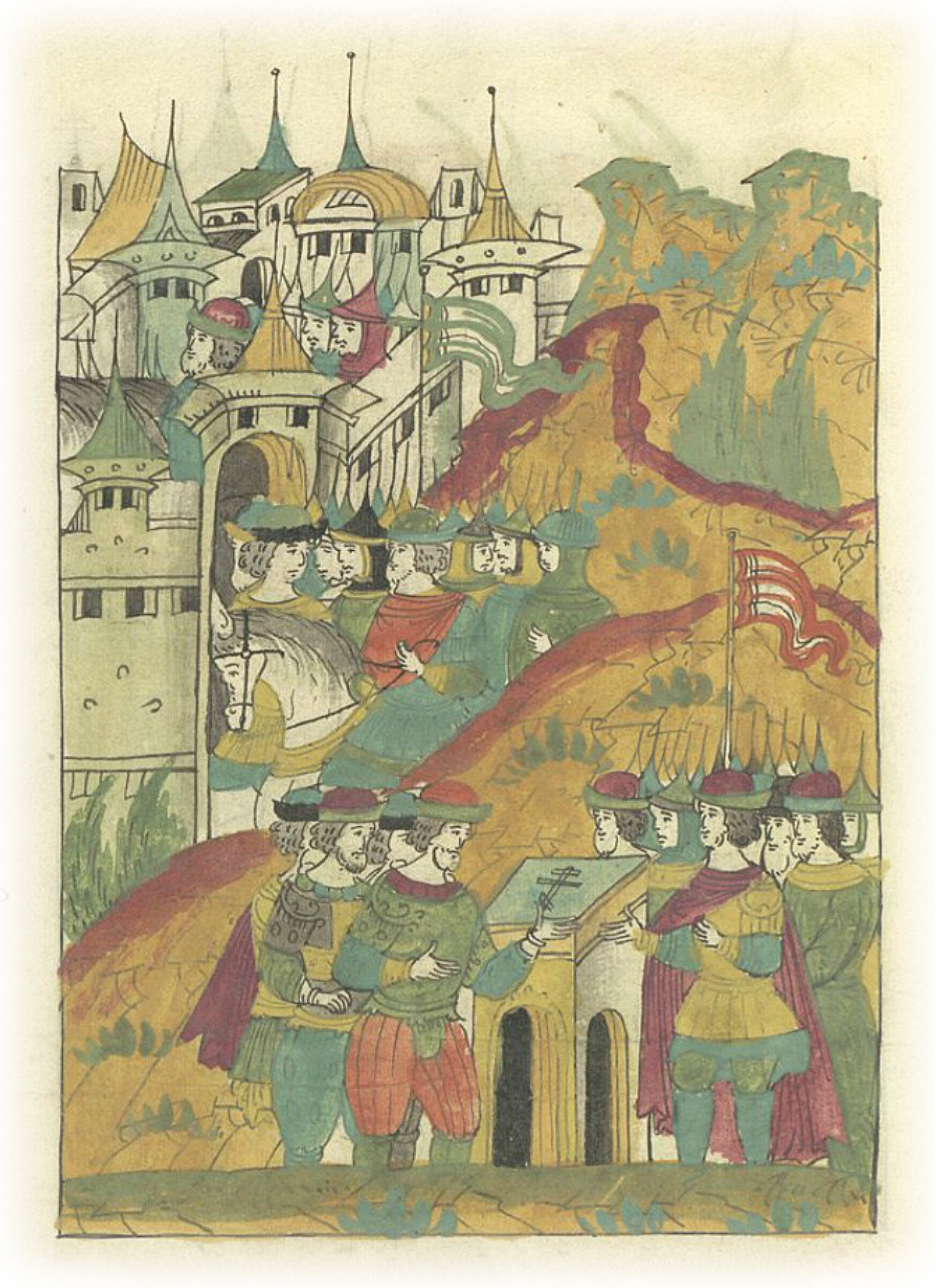 Взятие Юрьева. Воеводы приводят людей Юрьева к присяге царю Ивану Васильевичу и въезжают в город.