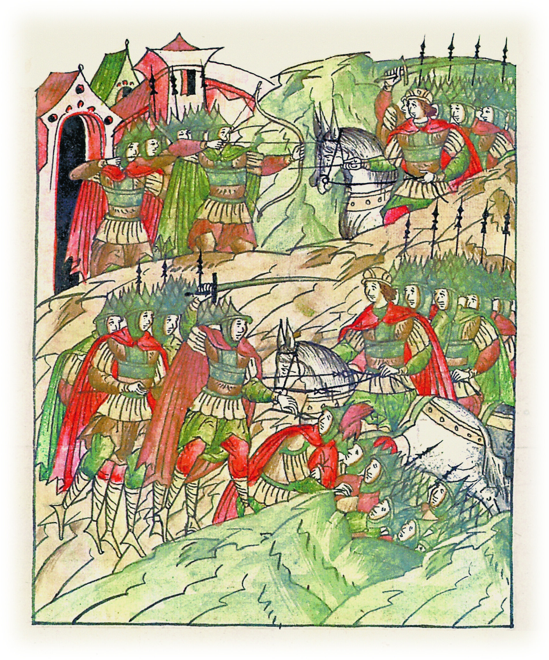 И вышли из города Луцка пешие бойцы, начали стреляться с ними; князь же Андрей Юрьевич пошел на них и изломил копье свое о супостата своего; и тут много побили воинства его пешие бойцы, и на самого князя Андрея Юрьевича напали, и ранили под ним коня двумя копьями, а третьим копьем (попали) в седельную луку переднюю.