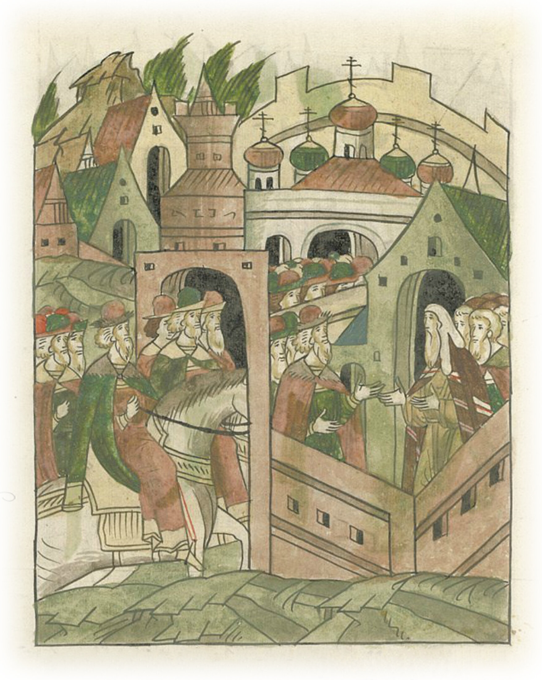 Великий князь Иван Васильевич с братьями князем Андреем Большим, князем Борисом, князем Андреем Меньшим и князем Василием Верейским входит в Великий Новгород.