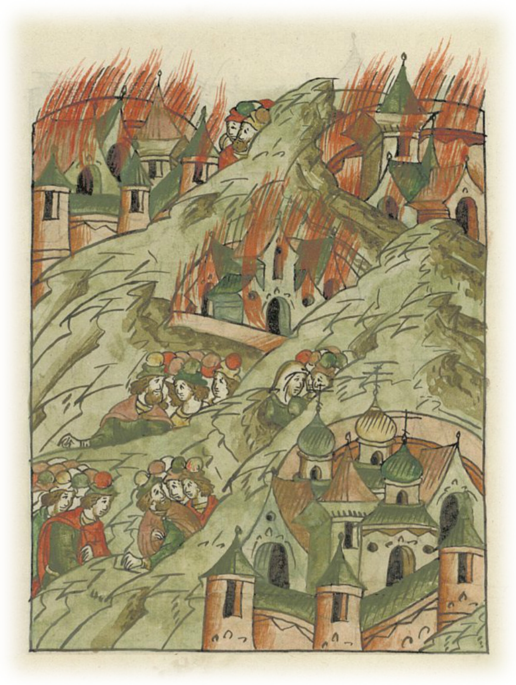 В том же году сгорели города Ладога, Руса и Городище, а в Новгороде каждый день загоралось невидимым (образом) от церкви Всех Святых до церкви Успения Пречистой Богородицы, и не смели тогда люди жить в домах, но жили в полях.