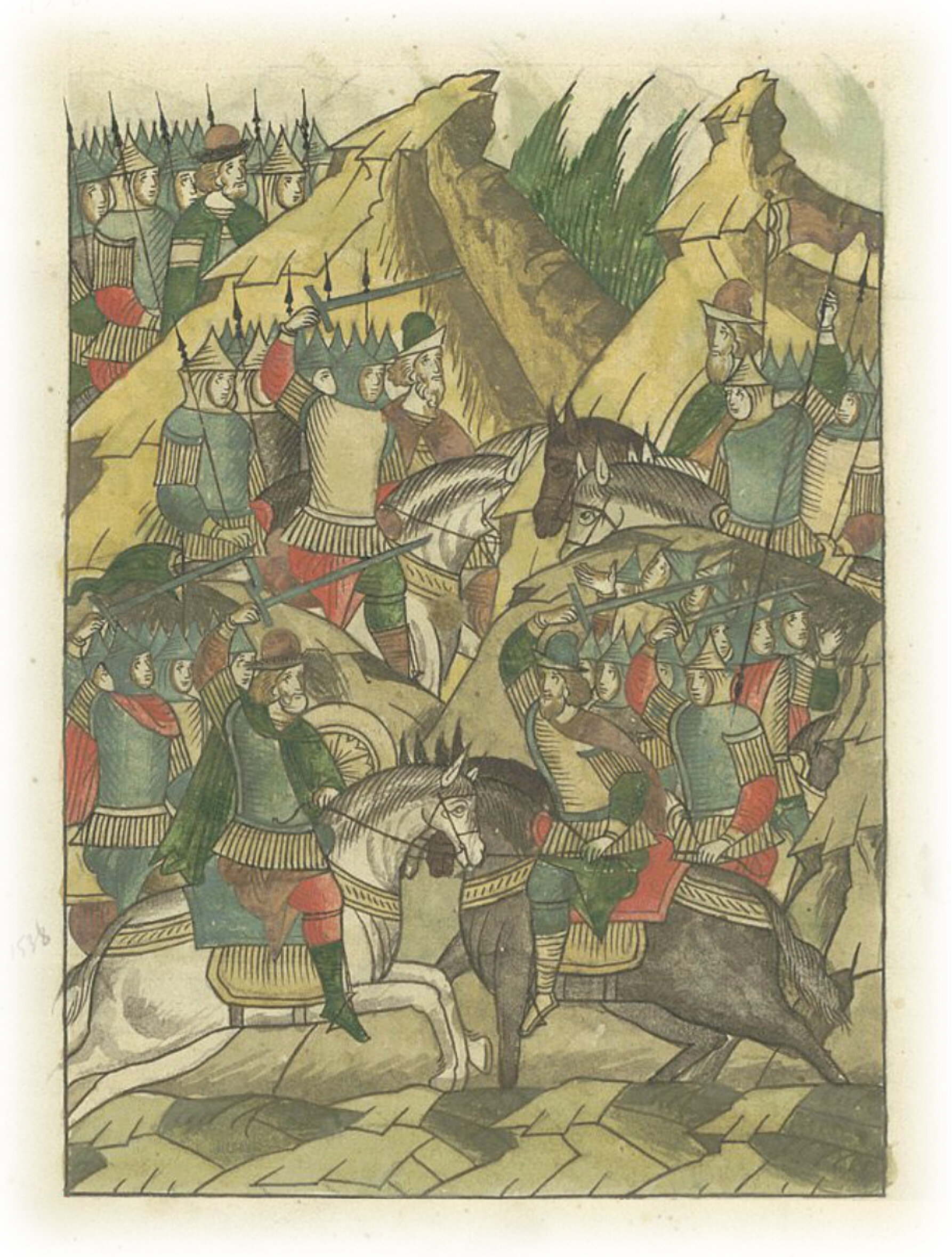 Войско великого князя Дмитрия Ивановича оказывает сопротивление татарам: с одной стороны на них ударяет князь Андрей Полоцкий, с другой - князь Данило Пронский, а сам великий князь Дмитрий Иванович ударяет спереди.