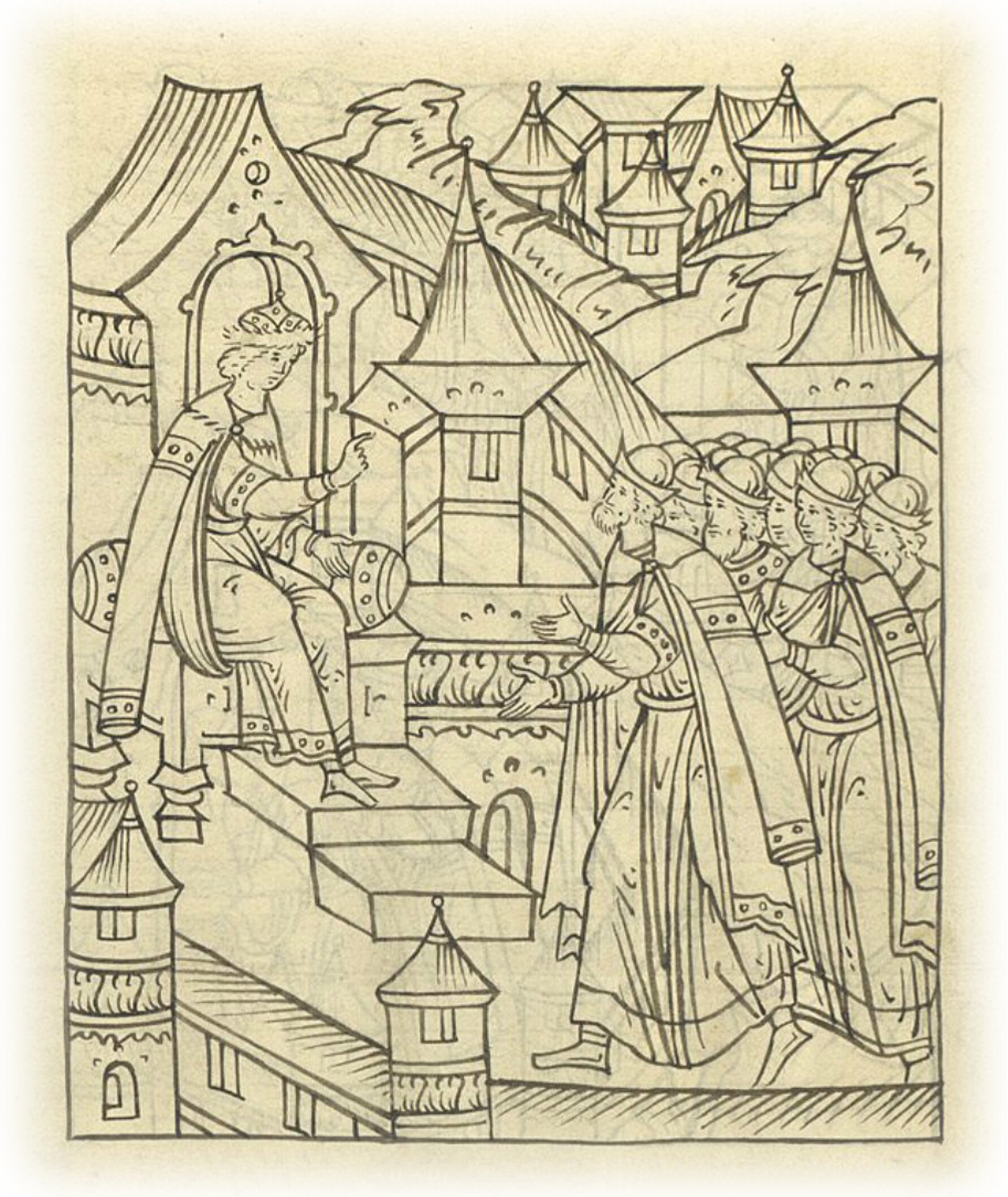 Ругодивские посадники Яким и Захар приезжают в Москву. Воеводы царя Ивана Васильевича Алексей Адашев и Иван Михайлов сообщают им, что государь пожалует их, если сдадут его воеводам помимо Ругодива Вышгород.