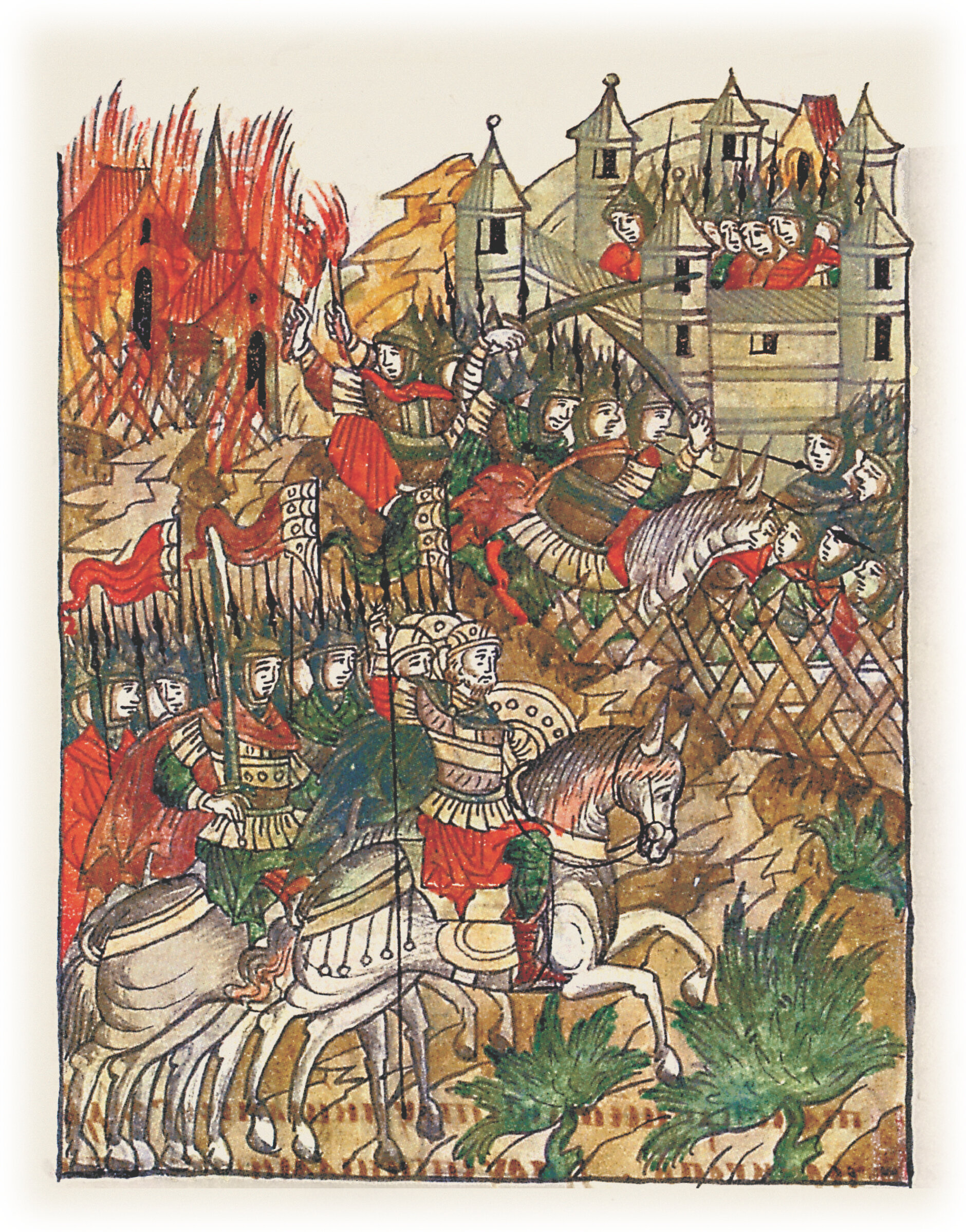 И пошли к городу, и встали, не дойдя города Семынь. Половцы же быстро устремились к городу и взяли острог, и зажгли, также и весь посад зажгли, и словно поле чистое около города сотворили,