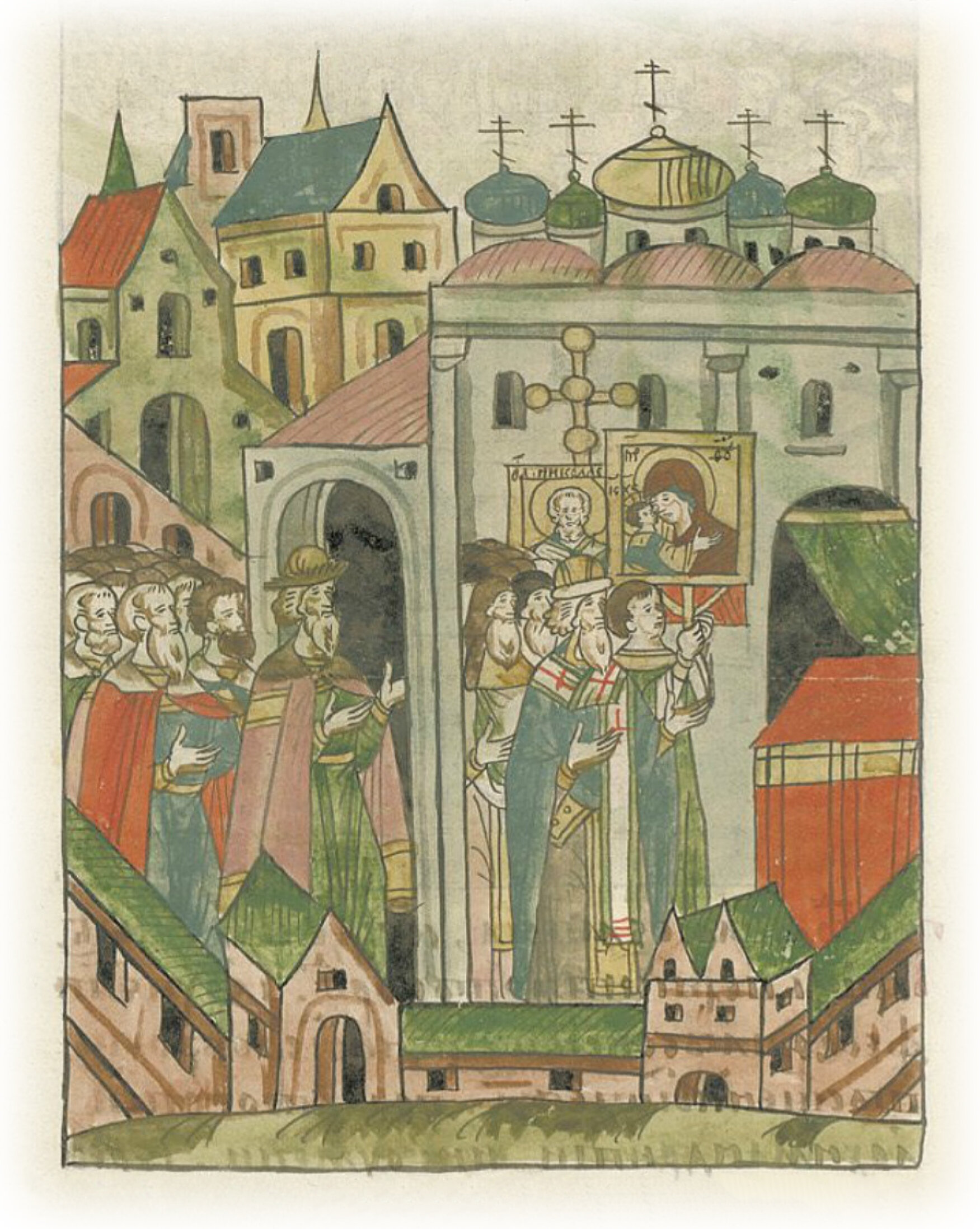 Архиепископ Феофил со всем освященным собором входит в церковь Премудрости Божьей Святой Софии, и великий князь Иван Васильевич заходит после него.
