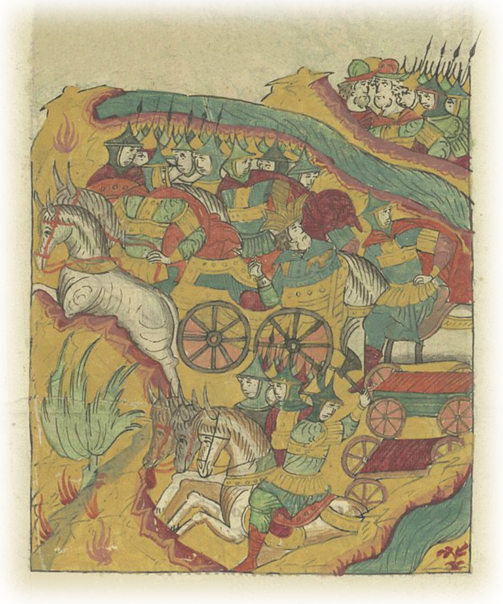 О, великое Божье милосердие! Пришел с такой великой похвальбой, а побежал с великим страхом, не в силах и на коне сидеть, и повезли его в телеге; многие же телеги порубили, а иные телеги с запасом бросили.