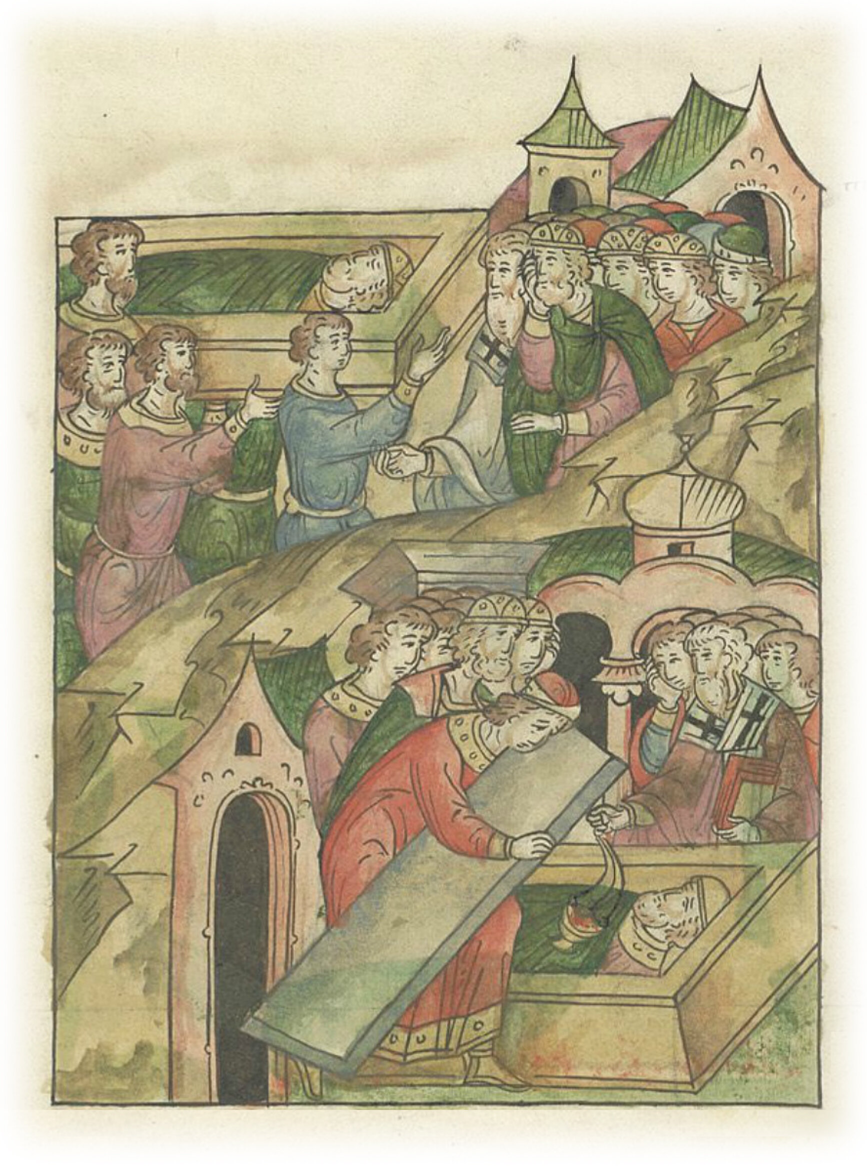 Когда же понесли его во Владимир, то встретил его Ярослав с братьями, и епископ Кирилл со всем клиром, и весь народ от мала и до велика; и не было слышно пения из-за многого плача, и так принесли его в соборную церковь святой Богородицы, и положили его во гроб со многими слезами, где лежит и отец его, князь великий Всеволод.