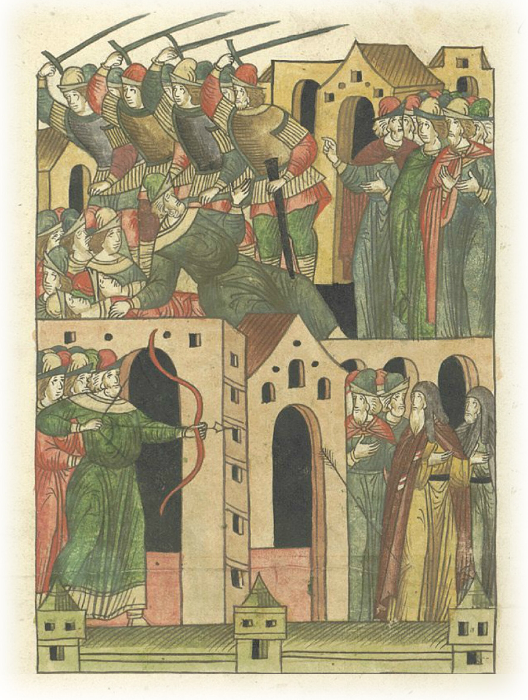Тогда же началась стрельба и в епископа, стрела попала в мантию епископа Дионисия, но сохранил его Господь Бог, собрались тогда люди и убили Сарая с его дружиною.