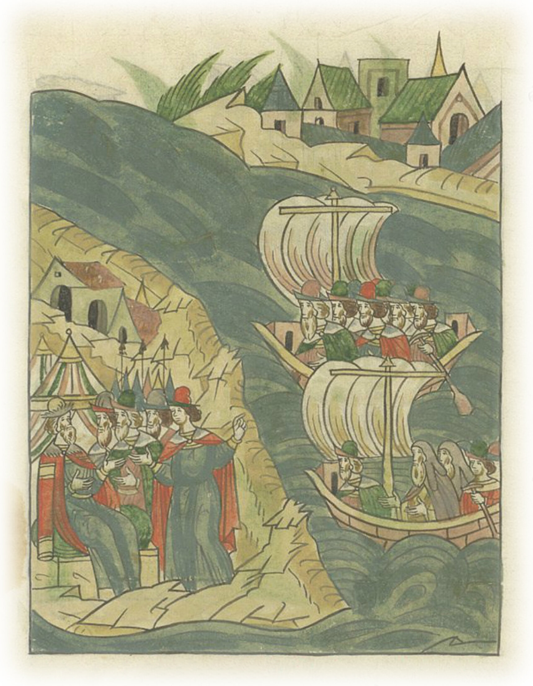О поставленном владыке Феофиле, о новогородцах, как приходили к великому князю с челобитьем. В тот же день пришли из Новгорода на устье Шелоны в судах озером Ильмень нареченный на архиепископство Феофил с посадниками, тысяцкими и с прочими городскими людьми со всех концов (новгородских).