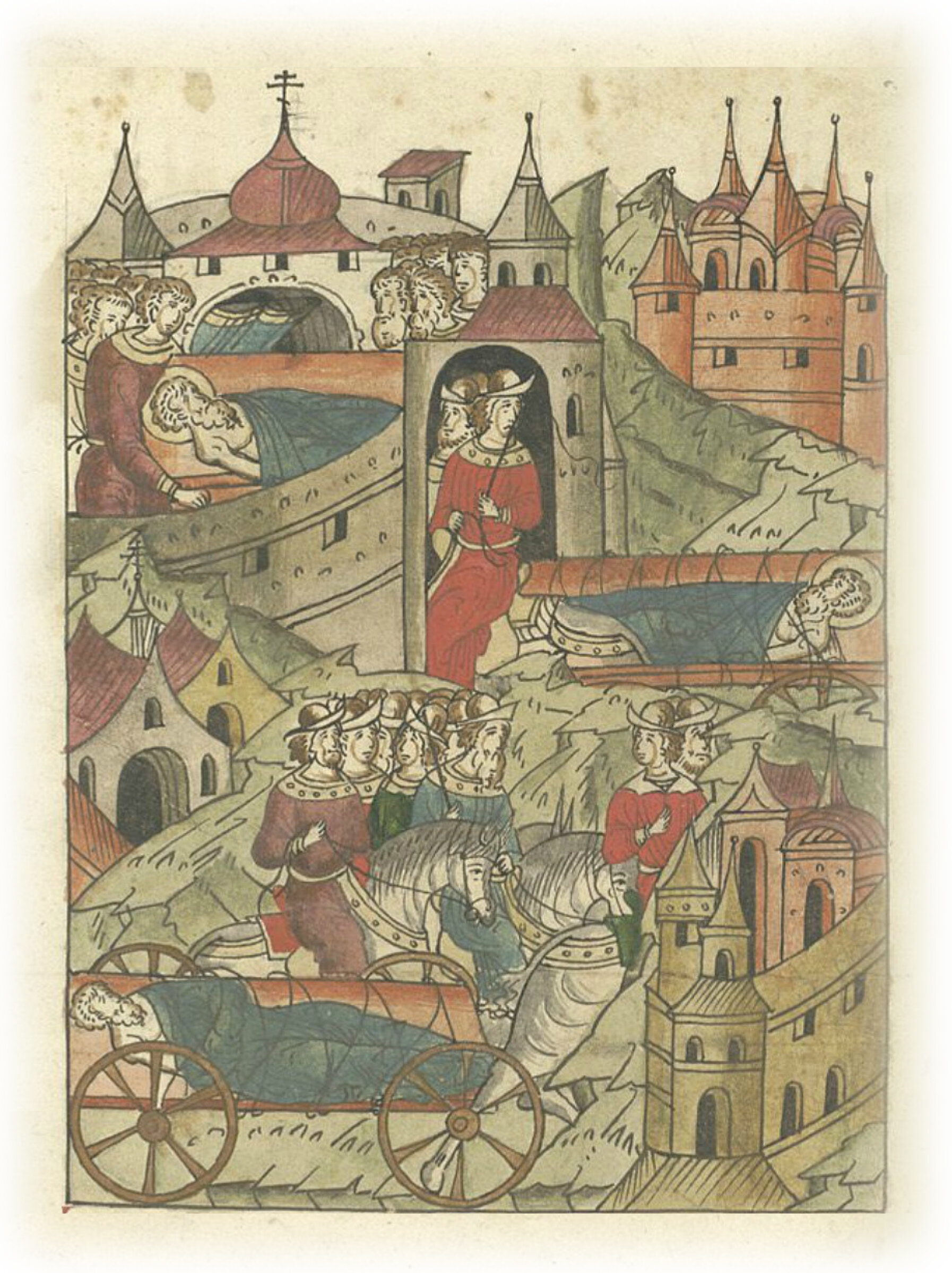 Оттуда же повезли его по русским городам, и так понемногу довезли его и до Москвы, и привезли его в город Москву, положили его в монастыре, в церкви святого Преображения, а в Твери об этом не ведали.