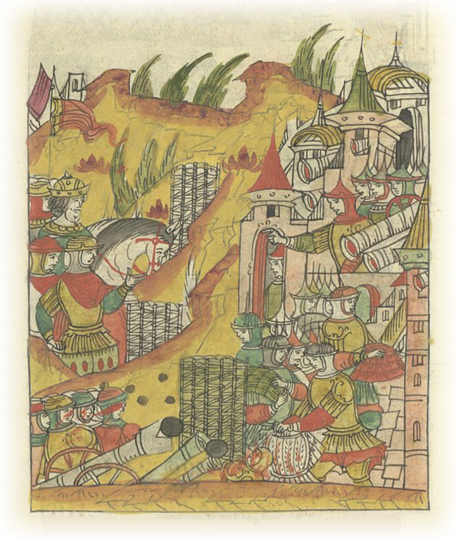 И Божьим милосердием и его государскою правдою побили у магистра многих людей и взяли в город, взяли доспехи и ратное, и много всякого имущества, и из города из пушек у магистра две пушки разбили.