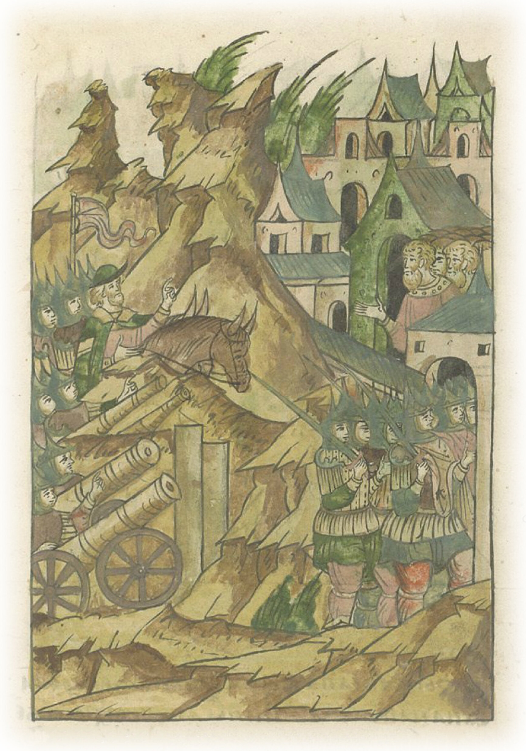 Воеводы же великого князя повелели воинам мужественно приступать к городу с пушками и пищалями, и, приступив к городу, взяли его силой,