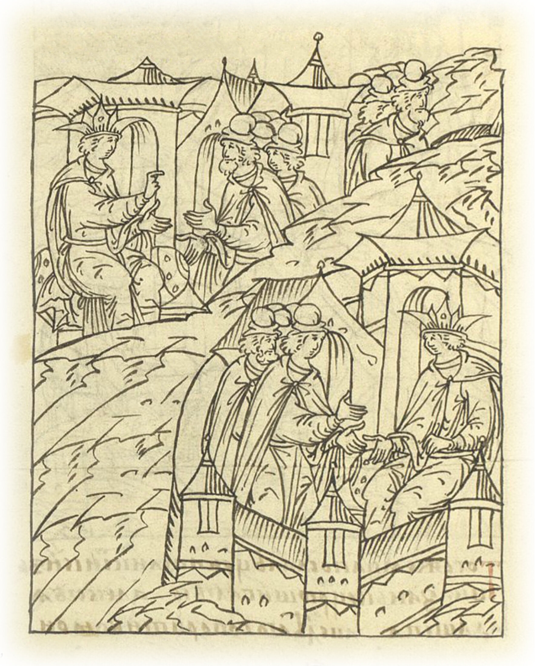 Ругодивские посадники Яким и Захар приезжают в Москву. Воеводы царя Ивана Васильевича Алексей Адашев и Иван Михайлов сообщают им, что государь пожалует их, если сдадут его воеводам помимо Ругодива Вышгород.