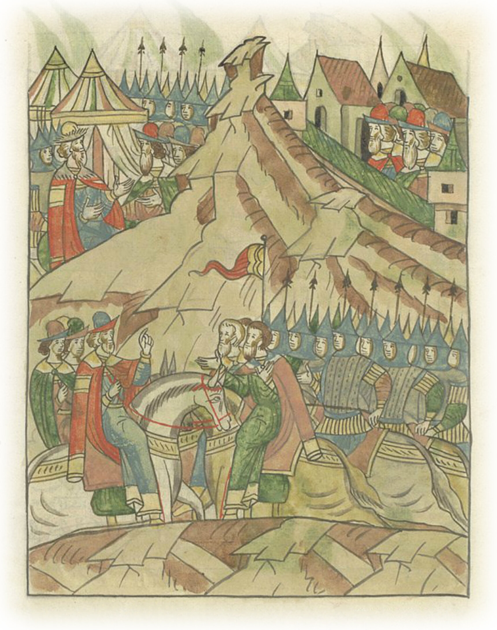 Языки говорят воеводам царя Ивана Васильевича, что магистр окопался большим рвом вокруг города Рындола, бьет из пушек и пищалей и приступает к Рындолу.