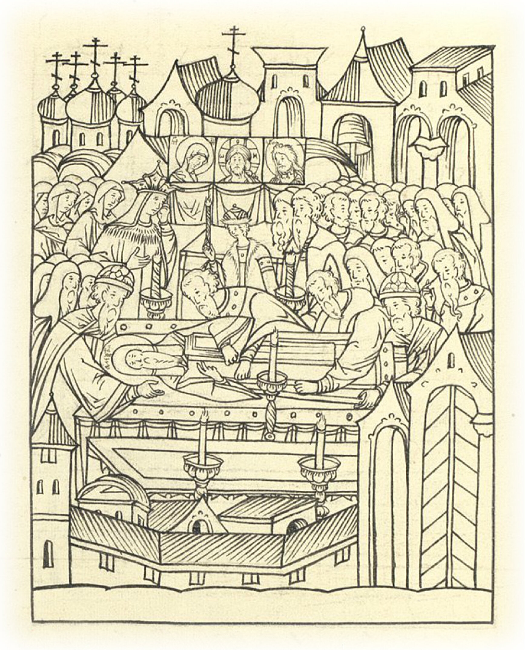 Отец же их Даниил митрополит сам с епископами и с архимандритами, и игуменами с честью переложили из старой раки в серебряную раку новую; а сам князь великий и его мать великая княгиня с боярами тут же стояли, молебен совершая, и с великими слезами молили святого.
