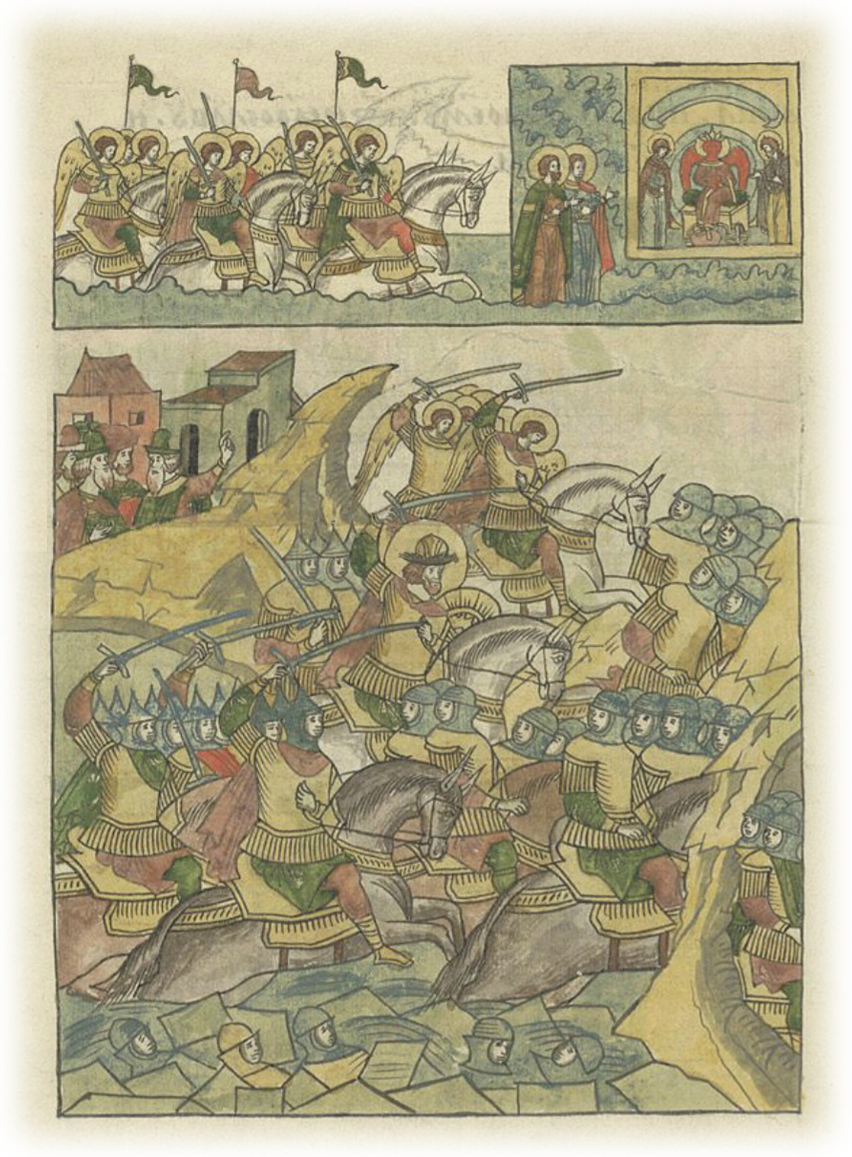 Был тогда день субботний, и, когда солнце взошло, сошлись оба полка. Немцы же и чудь пробились свиньей сквозь полки, и была тут сеча зла и велика с немцами и чудью; и стоял треск от ломающихся копий и звон от ударов мечей; и казалось, что озеро замерзшее двинулось, и не было видно льда, ибо все было залито кровью. И я слышал от очевидца, рассказавшего мне, что видел полки Божьи в воздухе, пришедшие на помощь великому князю Александру. И победил он с Божьею помощью, святой Софии и святых мучеников Бориса и Глеба, которые за нее пролили кровь свою. И побежали враги, и рубили их, гоня, как по воздуху, и некуда им было скрыться; и били их на льду на протяжении семи верст до Суболичского берега. И было убито 500 немцев, а чуди – бесчисленное множество. В плен взяли 50 знатных мужей, храбрых воевод, и привели их в Новгород, а иные в воде утонули, а иные жестоко ранены были и убежали. Был же бой этот 5 апреля в день Похвалы святой Богородицы, на память святого мученика Клавдиана. Здесь же прославил Бог великого Александра перед всеми полками, как Иисуса Наввина у Иерихона. «Вот, – говорили немцы, – возьмем великого князя Александра руками», а Бог ему их предал в руки его. И не было равного ему противника в бранях.