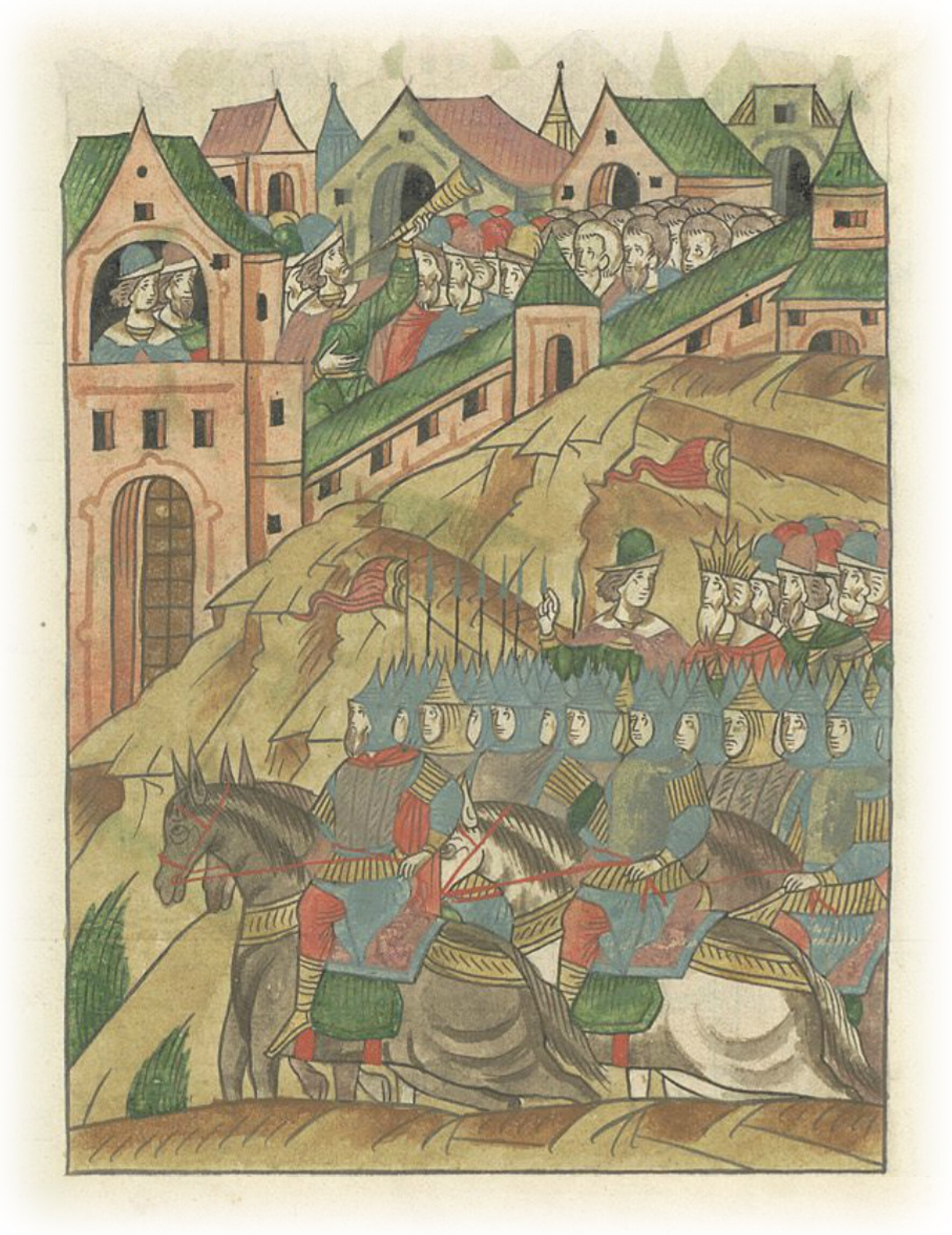 Тахтамыш же царь пришел к Москве месяца августа в 23-й день, в понедельник, в середине обеденного времени. И узрели их с городских стен, и вострубили горожане; они же пришли на поле городское и стали в поле за два или за три стрелища* от города. * мера расстояния, равная полету выпущенной из лука стрелы.