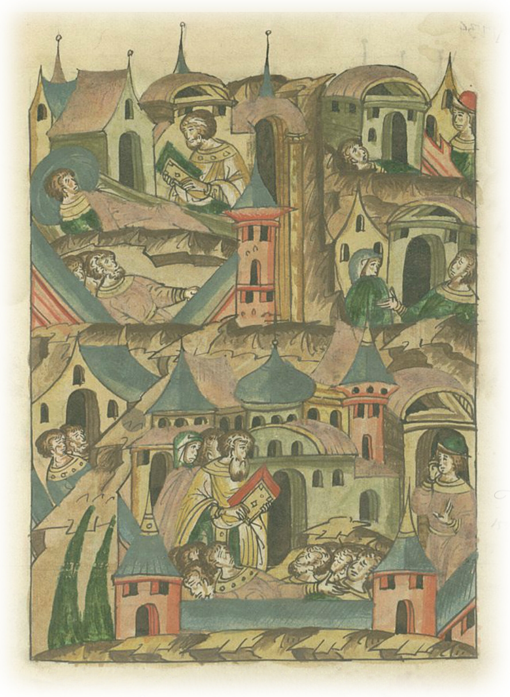 В ту же осень в Пскове и Новгороде месяца ноября начался сильный и страшный мор; вся земля потеплела. И совсем мало людей выжило в Русской земле после мора и засухи.