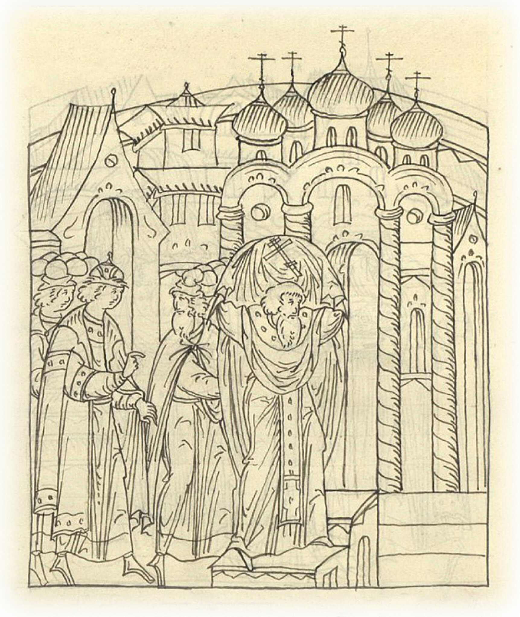 И отпустил его со святым животворящим крестом и со святыми бармами, и с царским венцом в соборную церковь Успения Пречистой Богородицы, а с ним послал своего конюшего князя Михаила Васильевича Глинского и своих двух казначеев, Ивана Ивановича Третьякова и Федора Ивановича Сукина, и двух дьяков Якова и Василия Григорьевых, детей Захарьиных.
