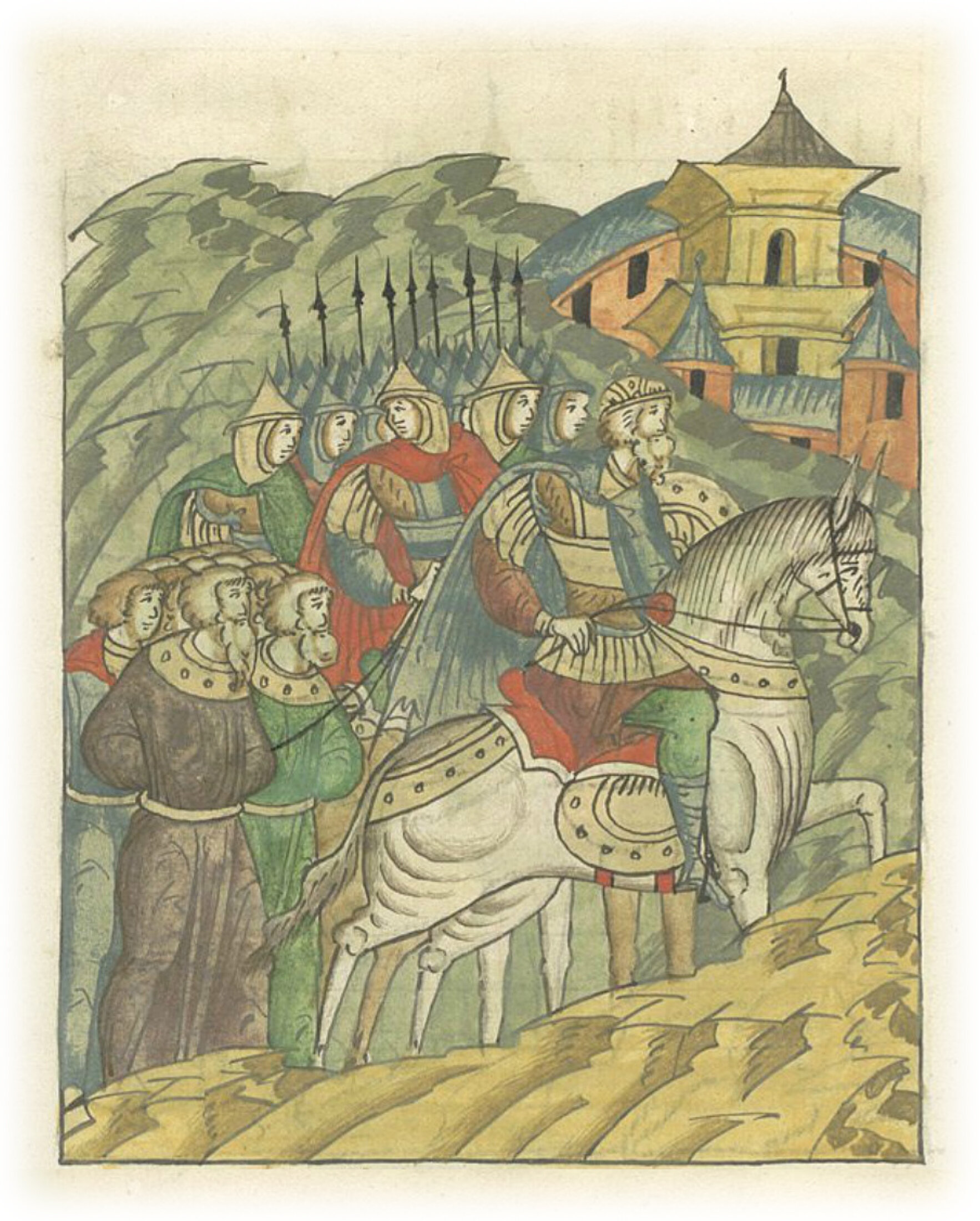 Великий князь Ярослав Всеволодович со множеством полона возвращается из Смоленска после победы над литовцами.