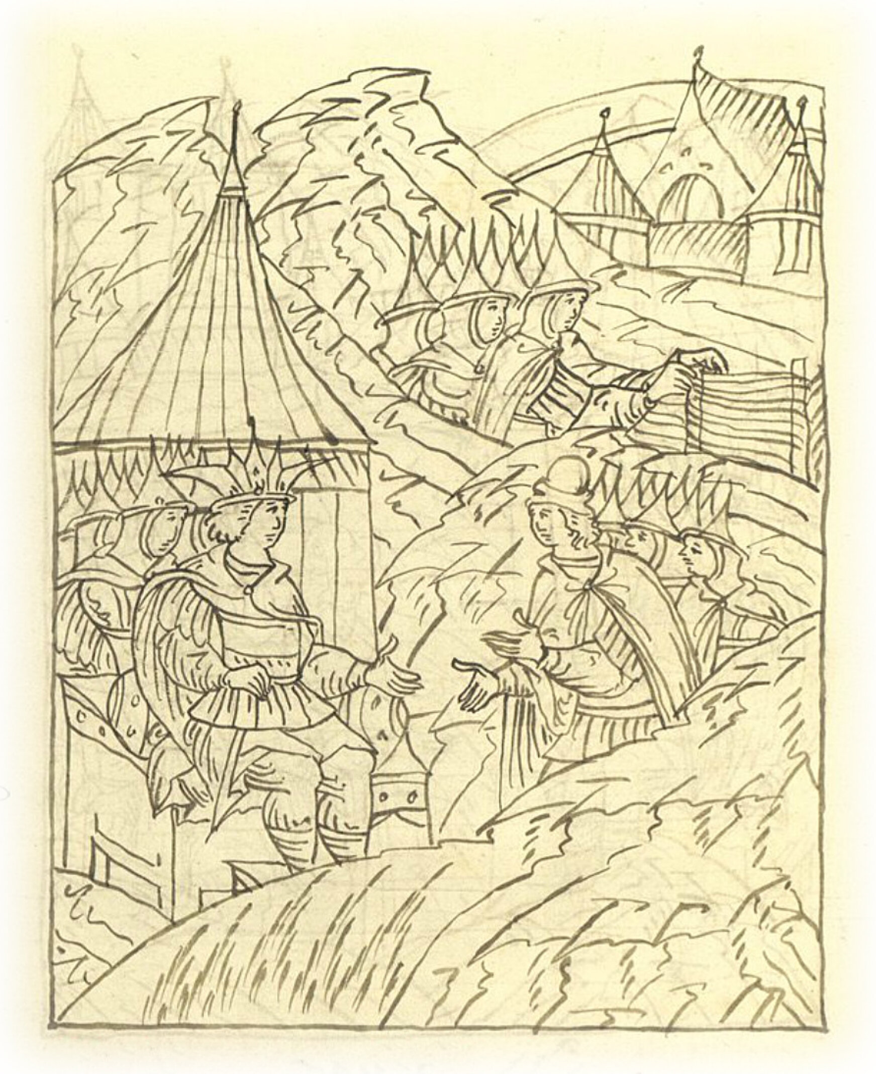 Языки говорят воеводам царя Ивана Васильевича, что магистр окопался большим рвом вокруг города Рындола, бьет из пушек и пищалей и приступает к Рындолу.
