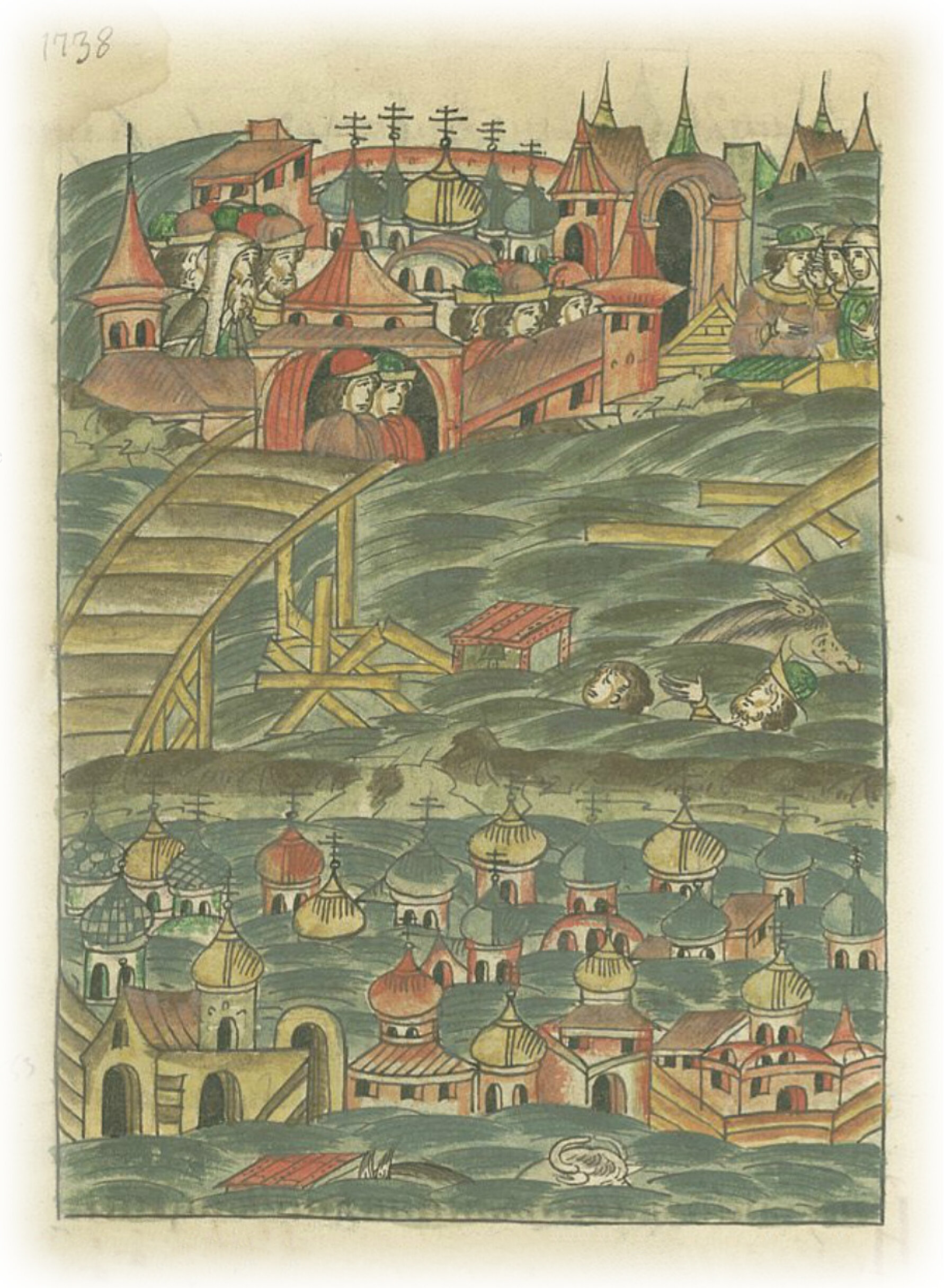 Река Волхов в Новгороде сильно разливается, сносятся мосты, храмы смываются с оснований. Люди спасаются на крышах домов.