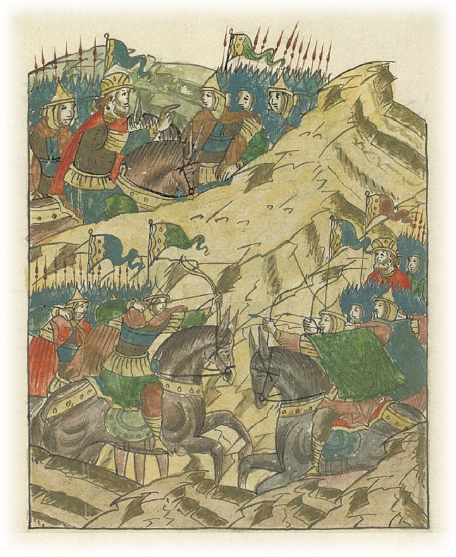 Князь же Михалко Юрьевич пришел и стал готовить полки свои, и погнал на рысях за дружиной князя Мстислава Ростиславича, словно хотел его уничтожить, и начали перестрелку стрельцы обоих полков,
