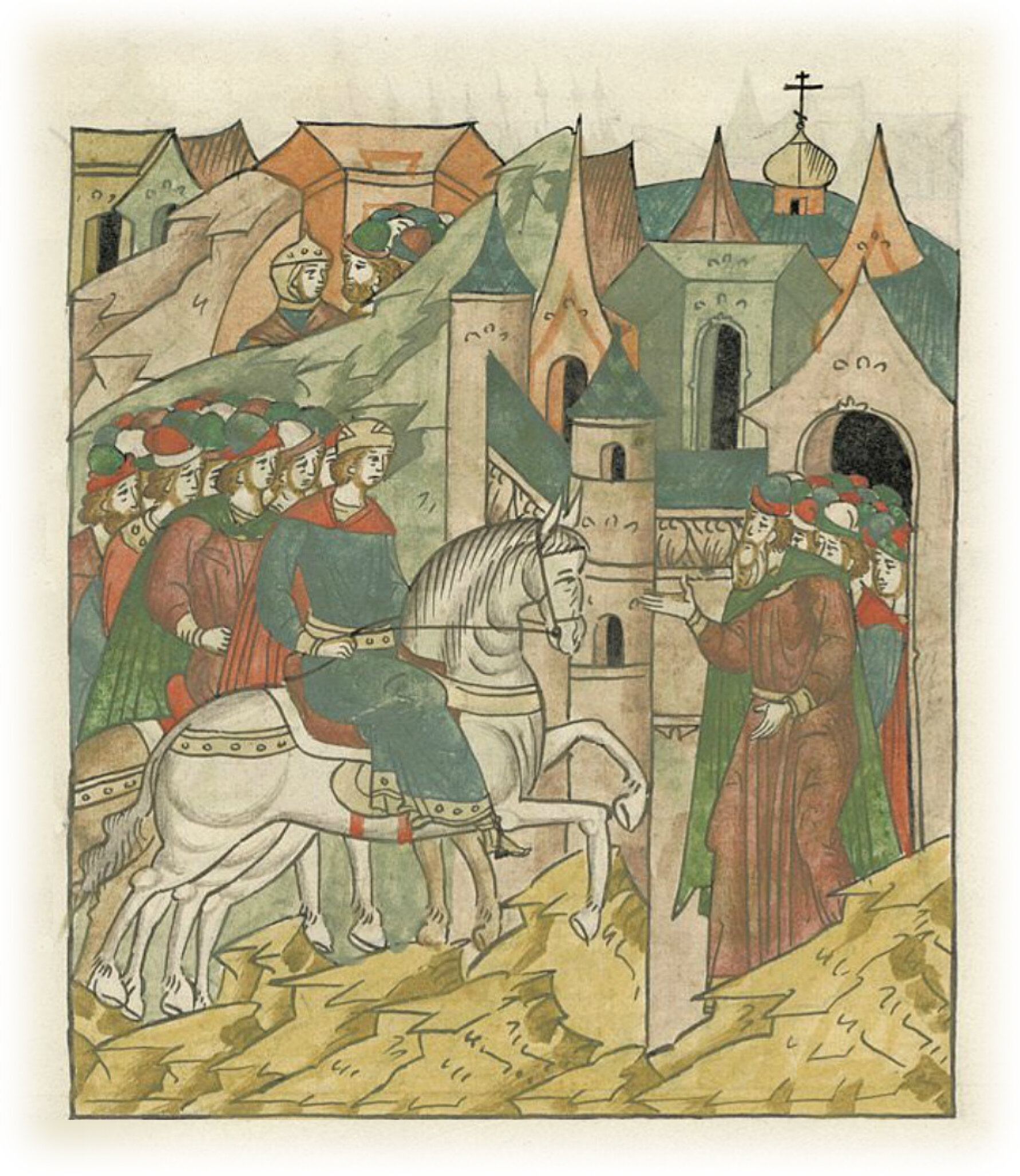 Черниговский князь Михаил Всеволодович идет в Новгород. Новгородцы с радостью принимают его.