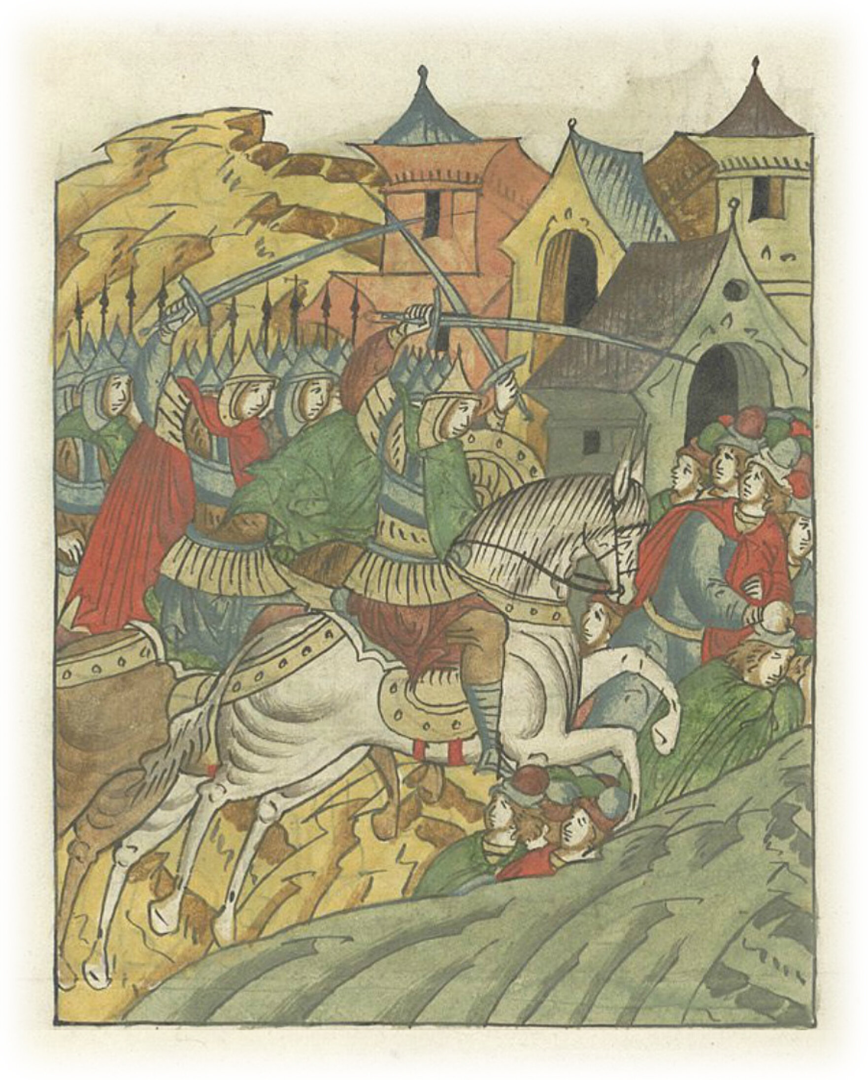 Языки говорят воеводам царя Ивана Васильевича, что магистр окопался большим рвом вокруг города Рындола, бьет из пушек и пищалей и приступает к Рындолу.