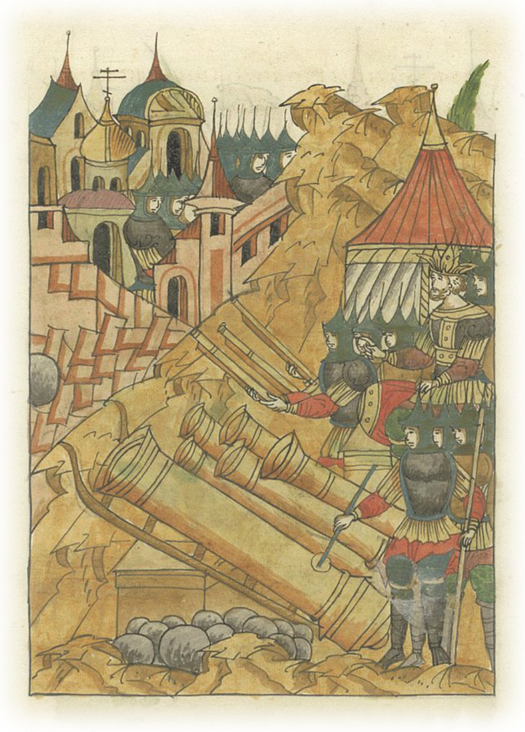 Языки говорят воеводам царя Ивана Васильевича, что магистр окопался большим рвом вокруг города Рындола, бьет из пушек и пищалей и приступает к Рындолу.