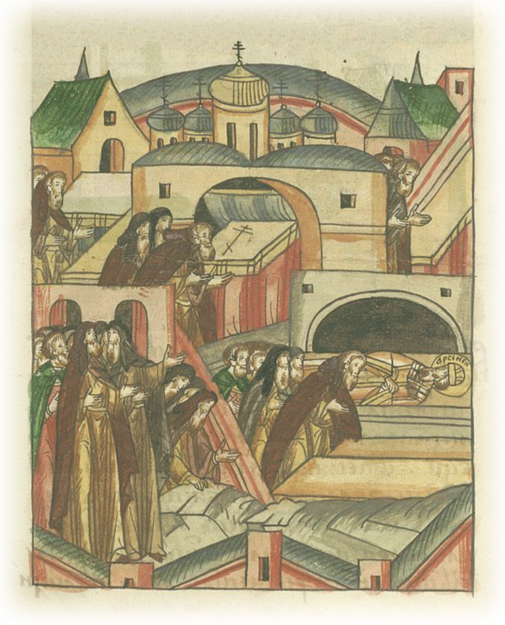 И целовали трапезу, на коей полагают святые страсти Христовы. И потом целовали святого Арсения патриарха и многих святых. Также целовали трапезу Авраамову, на которой угощал Христа Бога, в Троице явившегося. Также целовали одр железный, на котором Христовы мученики сжигаемы были. И пробыли все утро в церкви, поклоняясь и дивясь чудесам святых и величеству, и красоте безмерной церковной.