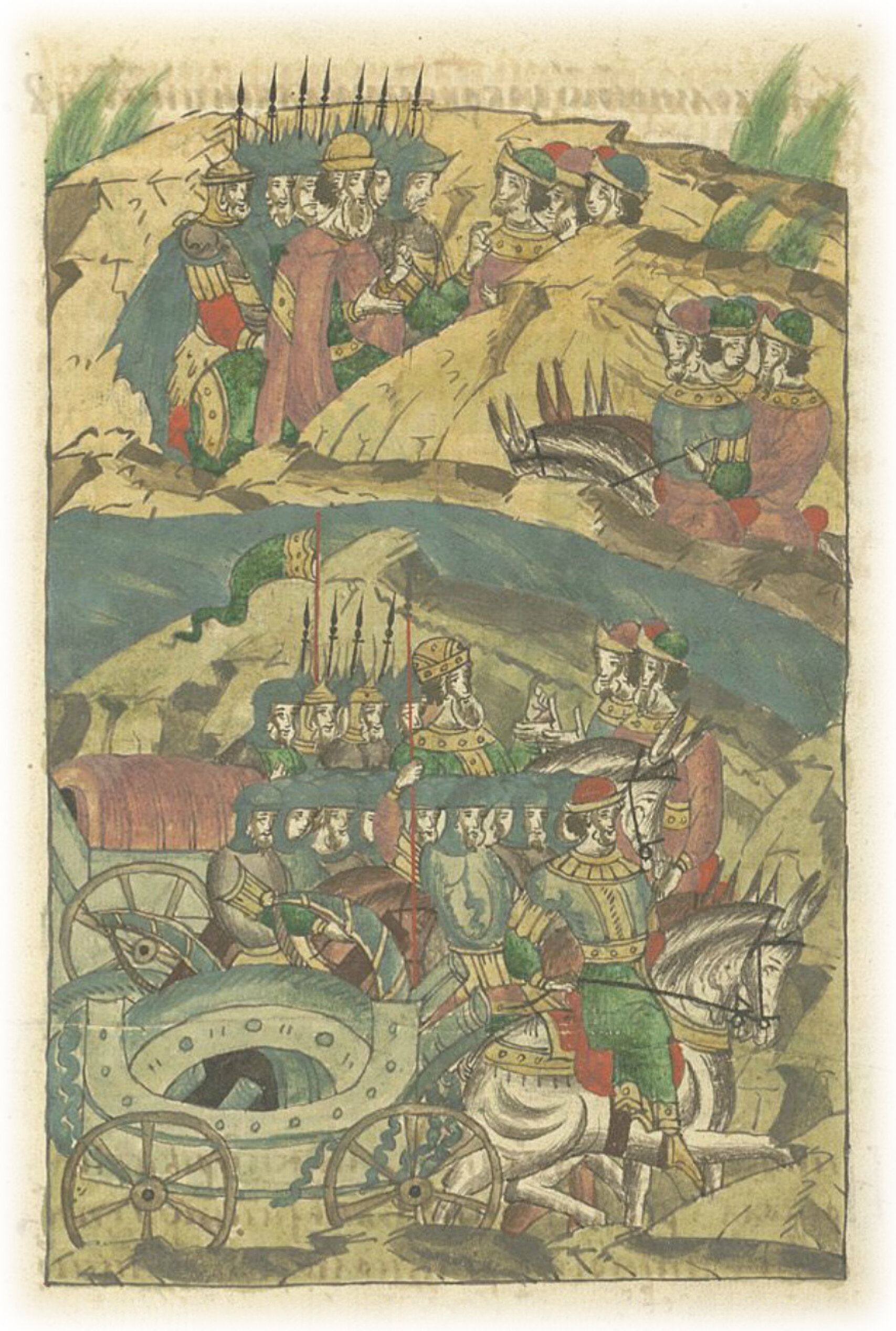 И послал своих послов к Витовту, а Витовт стоял на другом берегу реки Ворсклы с обозом кованых железом телег, вооруженный пищалями, пушками и самострелами. Сказал Едыгей: «Встреться со мной, о, добрый удалой Витовт!»