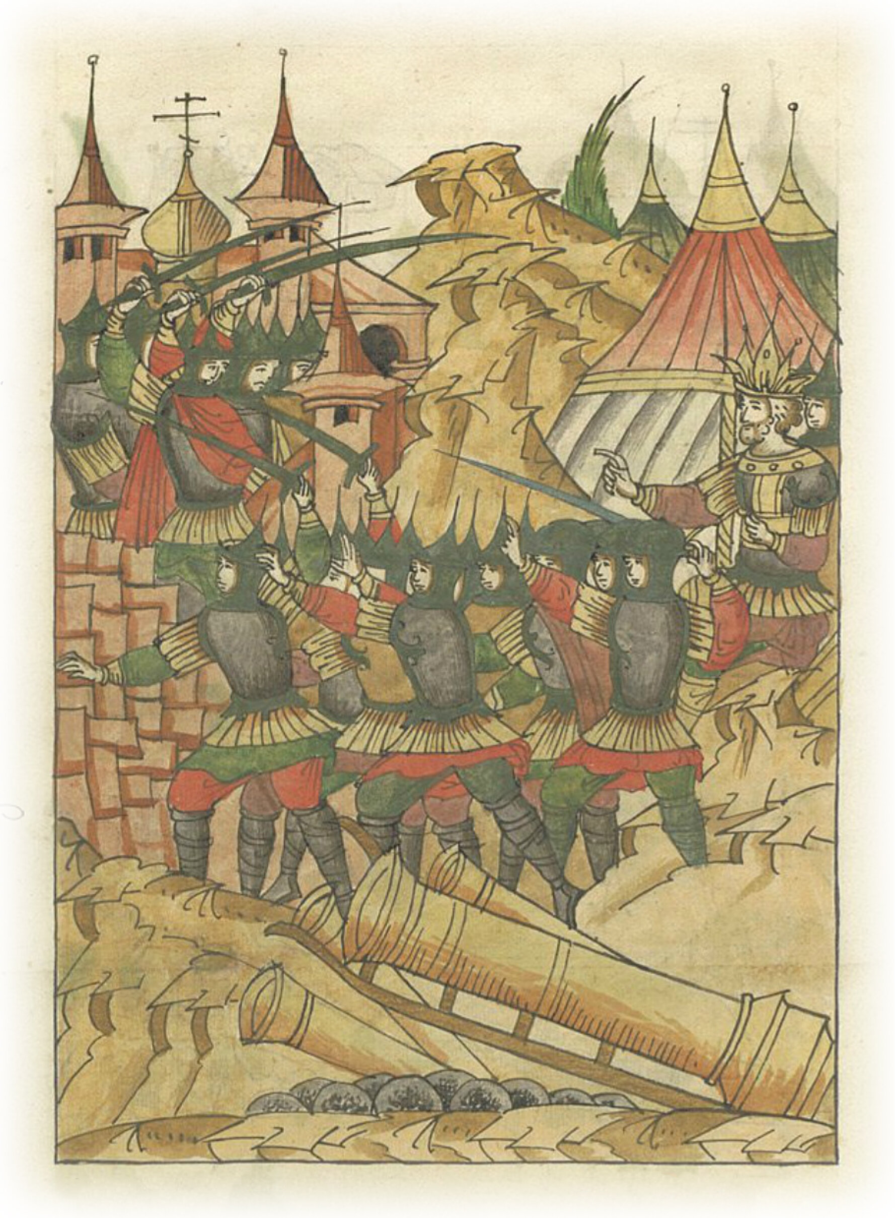 Языки говорят воеводам царя Ивана Васильевича, что магистр окопался большим рвом вокруг города Рындола, бьет из пушек и пищалей и приступает к Рындолу.