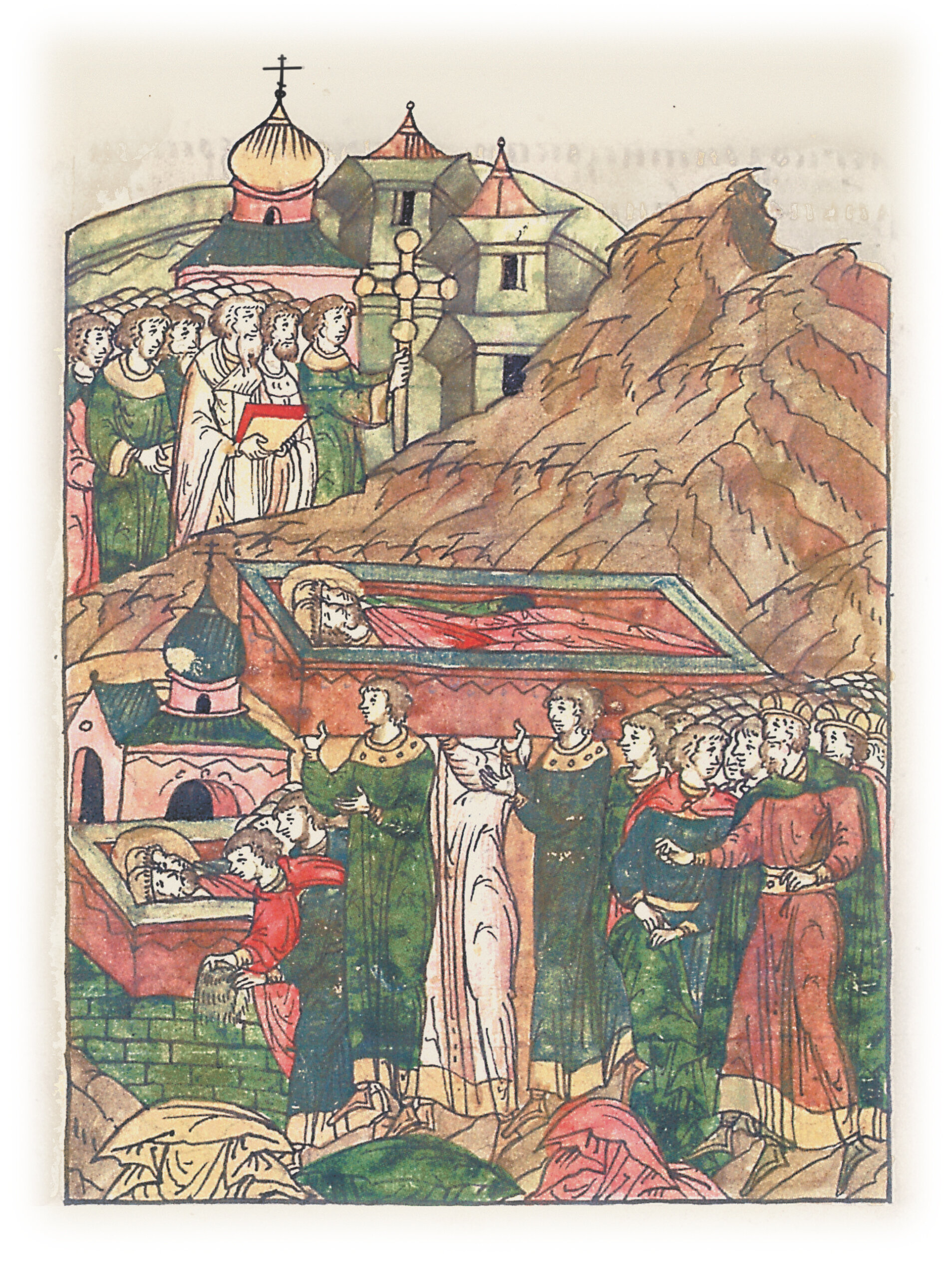 В 6623 (1115) году. Освящена была церковь каменная в Вышеграде, месяца мая в первый день, в субботу. Во второй день того же месяца перенесли все братья, русские князья, мощи святых страстотерпцев Бориса и Глеба в каменную церковь; и повелел Владимир Мономах бросать народу, сильно налегавшему, паволоки, драгоценные ткани, замшу и беличьи шкурки, чтобы легко дойти до церкви; и в четвертый день поставили их в каменном гробе на месте.