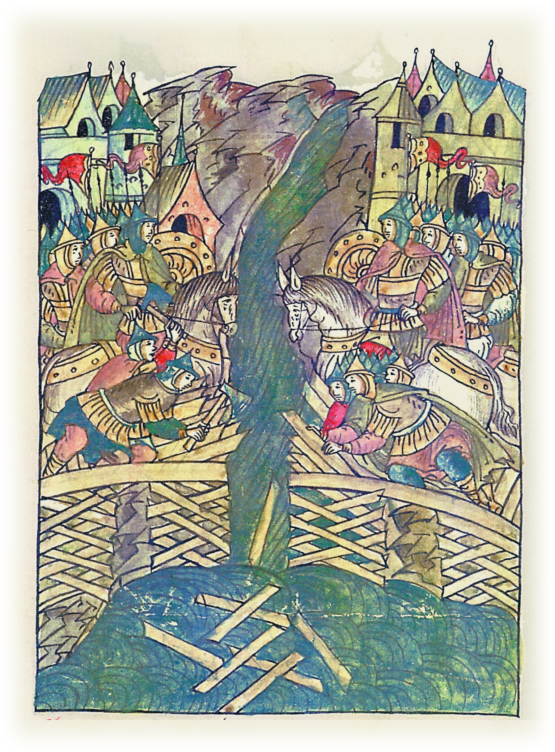 И тотчас мост разметали на Волхове, и полки многие вооруженные встали (на одной половине), а другие – на этой половине, и едва не началась сеча злая; ибо пришли в тот день князь Святослав Ростиславич и брат его князь Давид Ростиславич.
