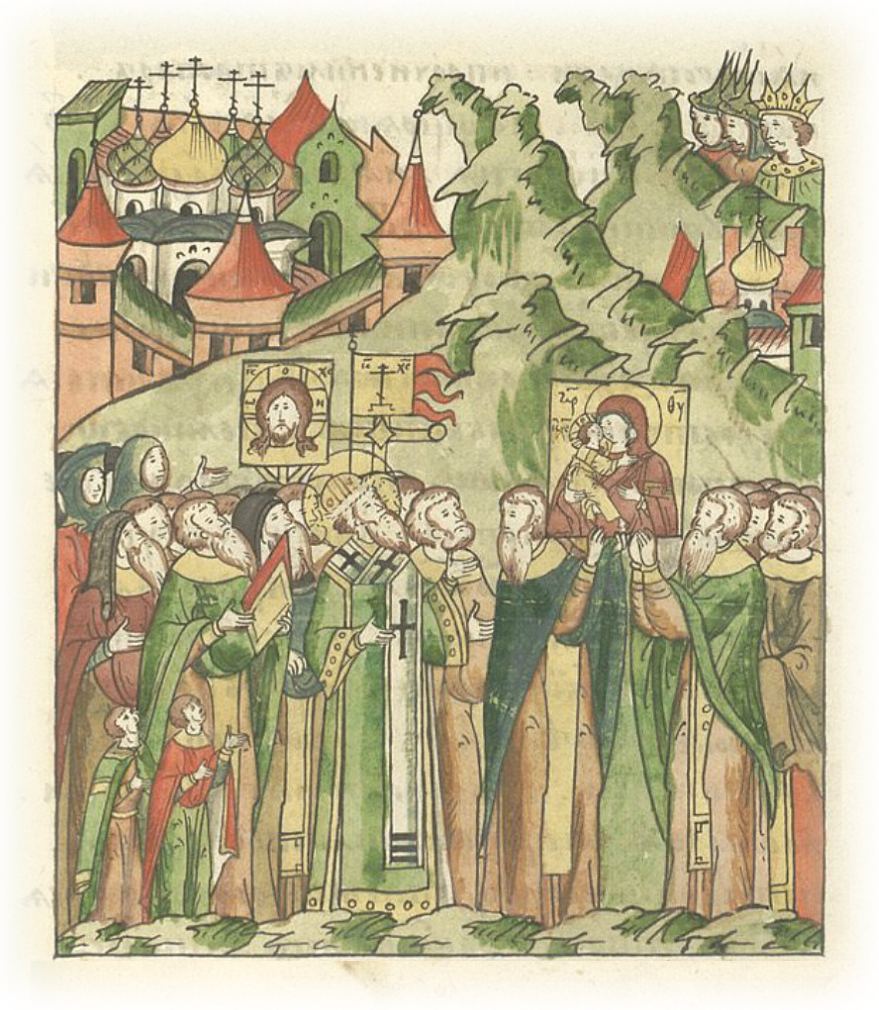 И, встав от земли и воздев руки вверх, воскликнули: «О, пресвятая госпожа дева Богородица, всемилостивая Владычица! Ныне пришествием своим помилуй и спаси нас, испуганных рабов Своих, не ждущих ниоткуда помощи, кроме как от Тебя и от Тебя рожденного Христа Бога нашего, Ему же, не переставая, молись о нас, и ниспошли нам щедроты Твои, о Владычица, и избавь нас и город наш, и все города наши, и места от нашествия нечестивых, и от наступающего врага Темир-Аксака, хвалящегося пойти против нас, и против прочих с ним татар, и от всех врагов, покушающихся на нас, и от плена, и от огня, и от меча, от голода и всякой погибели, и от всякой беды и скорби, и от междоусобных браней. Видишь, о, владычица Богородица, сколько зла против нас! Смилуйся к нам, грешным и недостойным рабам Твоим, ибо великое упование имеем к рожденному Тобой Богу, Его же престол постоянно на небесах. Но нам на земле даровал Он Твою честную икону, на нее, как на живую Тебя, Матерь Божию, смотрим мы сердцем и устами с любовью целуем. Хоть и не должны мы надеяться на это за премногие грехи наши, но мы – жребий, доставшийся Тебе и стадо Твое, здесь прославляется имя Сына Твоего, Христа Бога нашего, и Твое, о владычица Богородица! Мы же, недостойные, всегда Тобой были избавляемы от всех зол, воссылаем Тебе благодарения, вспоминая древнее Твое обещание, когда божественному евангелисту Луке, написавшему на иконе твой чудотворный образ и к Тебе, Царица, принесшему его, Ты, посмотрев на него, сказала, что в ней на века будет пребывать благодать. Ты, о, владычица Богородица, и ныне наполни нас, недостойных, благодатью своей и помилуй нас! Ты, о, владычица Богородица, при преславном своем Успении обещала не оставить сей мир, но всегда любить и сохранять! Ты, о, владычица Богородица, всем языкам, всему роду (человеческому) даешь помощь, когда просят, и от всех бед избавляешь! Ты, о, владычица Богородица, и нашу новопросвещенную землю Русскую не презрела и с нами, смиренными, обещала быть. Ты же, Царица, сама, очевидно, прислала из Царьграда умельцев с золотом, чтобы создать себе церковь в Печерском монастыре в Киеве, и Сама сказала: «Хочу на Руси жить». Ты, о, владычица Богородица, свой чудный образ, который многие называют Вторичная икона, в древности называвшаяся по-римски «Лидская», которую блаженный патриарх Герман велел переписать в Лиде с подлинного; и из-за иконоборческого царя Льва Исаврянина в Рим отпустил ее, послав по морю, и так сама святая икона пришла в Рим за сутки. Через 130 лет опять сама икона вышла из римской церкви по морю, пришла в Царьград при царе Михаиле и матери его Феодоре в годы правления русского великого князя Рюрика. Потом явилась в нашей Русской земле в воздухе на реке Тихвине, несомая невидимыми святыми ангелами, где и доныне пребывала, творя бесчисленные чудеса и подавая в изобилии исцеления всем, с верою к ней приходящим. Ты, о, владычица Богородица, вручила престол всей Русской митрополии великому святителю митрополиту Петру, ведь было извещение от Твоего честного образа, видение в море Геронтию, который помышлял тот престол занять. Ты же ему запретила и тому, кто написал Твой образ, назвала имя Петра, который должен быть пастырем христианского стада, которого Сын Твой, Бог наш, прославил чудесами и нам молебника за нас дал. Ты, о владычица Богородица, видимой явилась преподобному иг