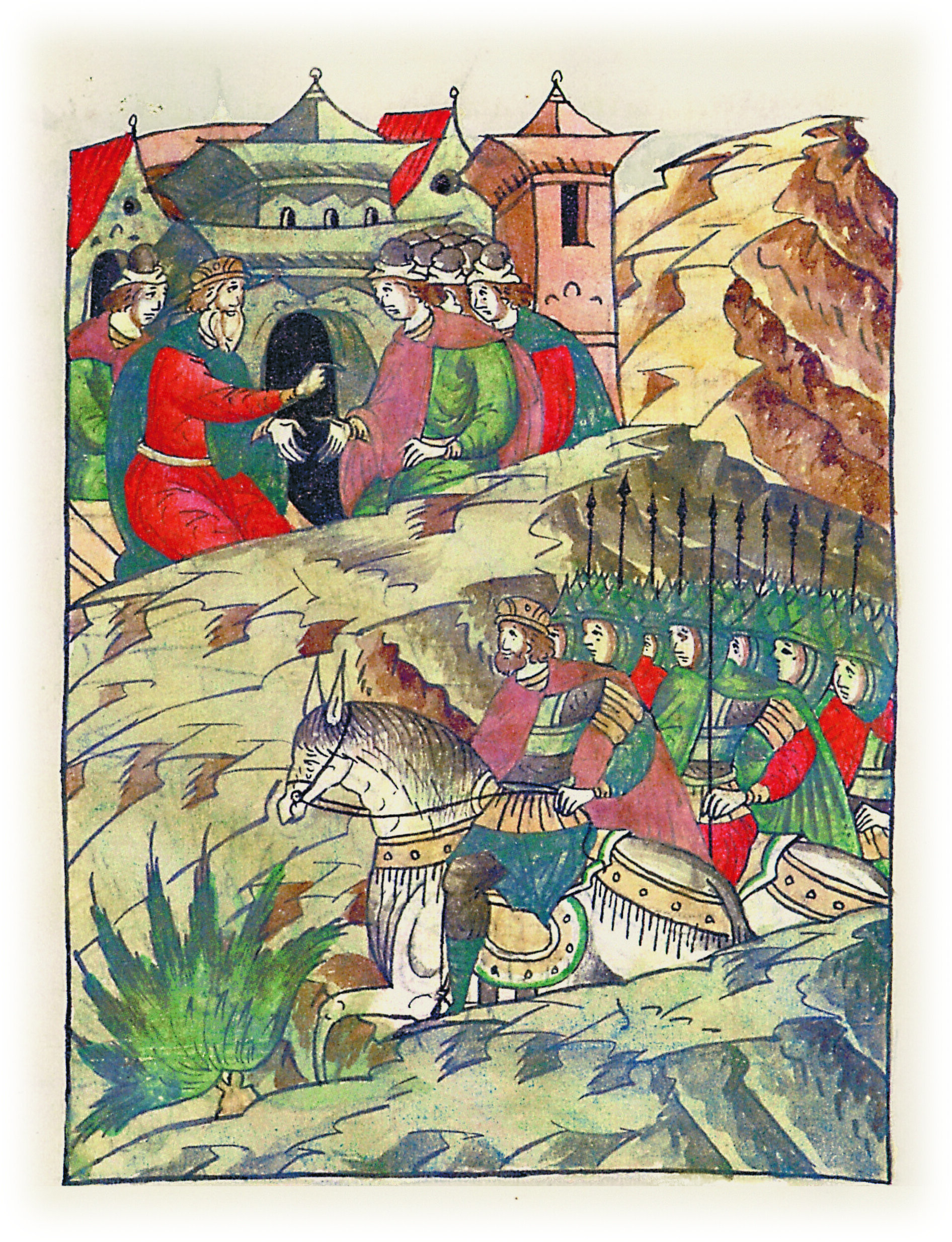 Языки говорят воеводам царя Ивана Васильевича, что магистр окопался большим рвом вокруг города Рындола, бьет из пушек и пищалей и приступает к Рындолу.