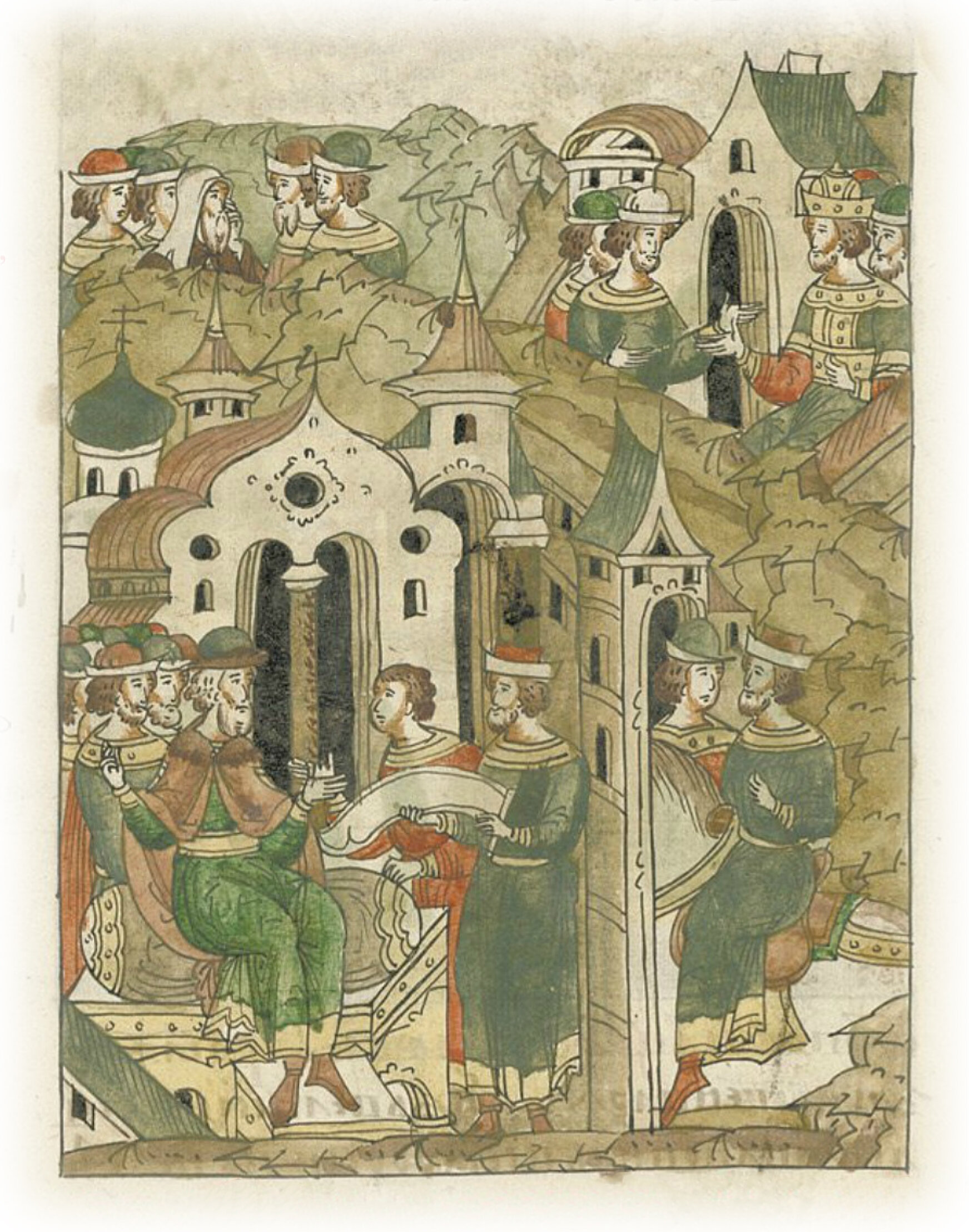 Ругодивские посадники Яким и Захар приезжают в Москву. Воеводы царя Ивана Васильевича Алексей Адашев и Иван Михайлов сообщают им, что государь пожалует их, если сдадут его воеводам помимо Ругодива Вышгород.