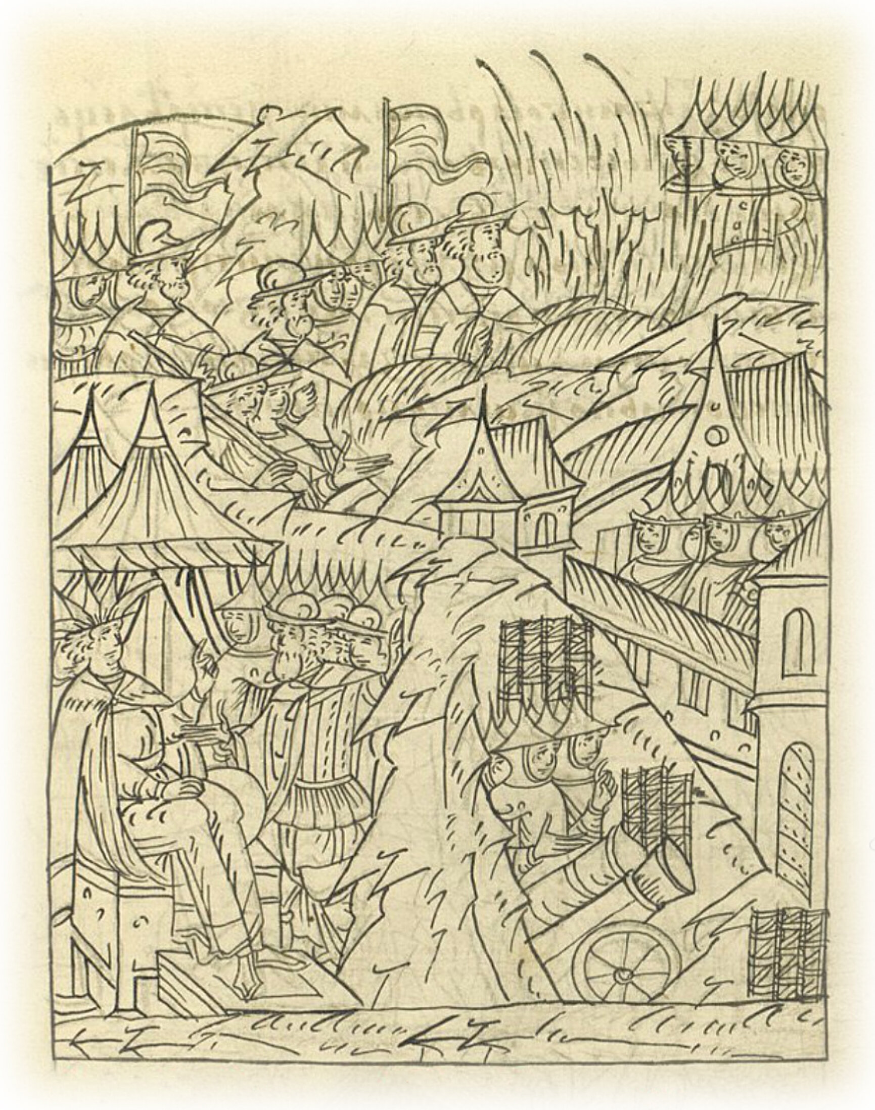 Языки говорят воеводам царя Ивана Васильевича, что магистр окопался большим рвом вокруг города Рындола, бьет из пушек и пищалей и приступает к Рындолу.