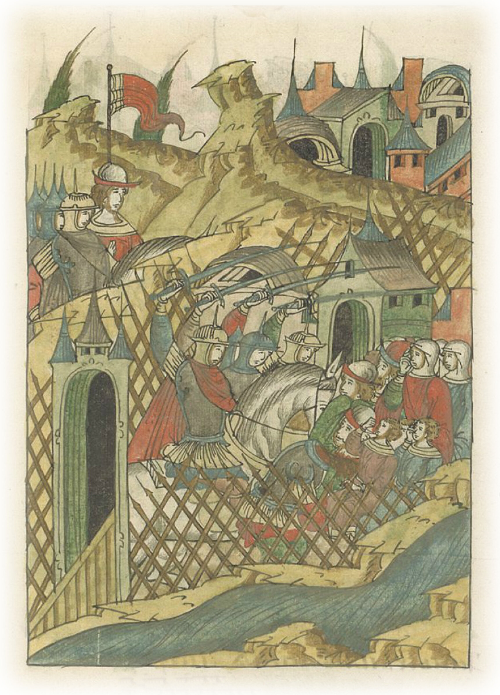 Языки говорят воеводам царя Ивана Васильевича, что магистр окопался большим рвом вокруг города Рындола, бьет из пушек и пищалей и приступает к Рындолу.