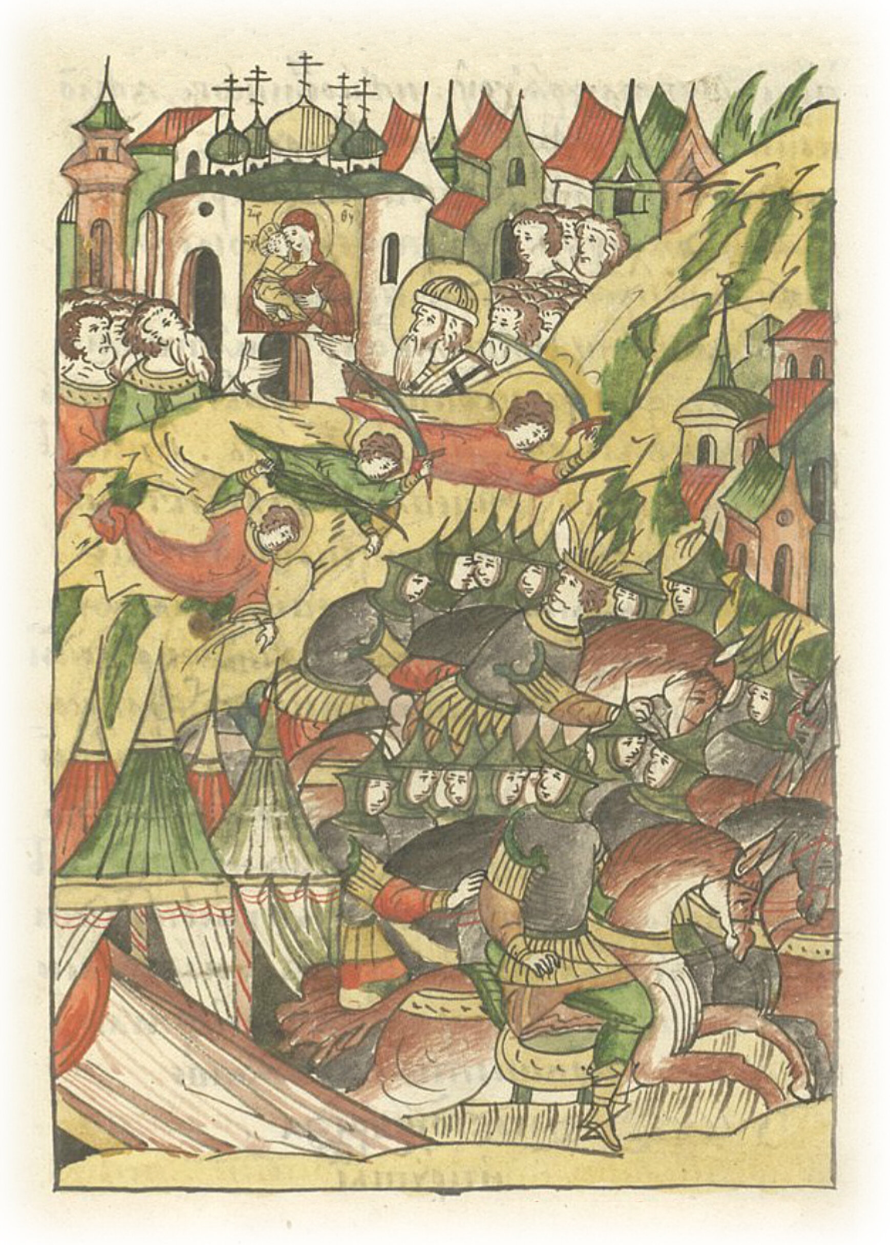 О побеге царя Темир-Аксака. И вскоре повелел он всю силу свою бесчисленную повернуть, и кинулся бежать со всей своей тьмой тысяч воинов, никем не гонимый. А земли Русской не тронул, ничем не навредив ей. И быстро побежал к Орде, откуда и пришел, и перед глазами видел, будто некое многочисленное воинство гнало его с Руси. Но не мы их гнали, истинно говоря, гонимы были Божией непобедимой силою и предстательством, и заступничеством за нас владычицы нашей Богородицы, и молитвами великих Божиих угодников, новых чудотворцев русских и всех святых. Об иконе Владимирской. Вот такая победа Богоматери была против врагов наших! Так одолели безбожных татар, которые не видели полков наших, не слышали князей русских, с воинством идущих на них. Но только возопили христиане в печали к Богу и пречистой Его Богоматери, и Господь услышал их, и послал страх и ужас на нечестивых агарян, и замыслы их разрушил. Так распались коварные замыслы их, и мы избавлены были с помощью Господа Бога нашего, который даровал нам бескровную победу, благодаря молениям скорой помощницы нашей пречистой Богородицы.