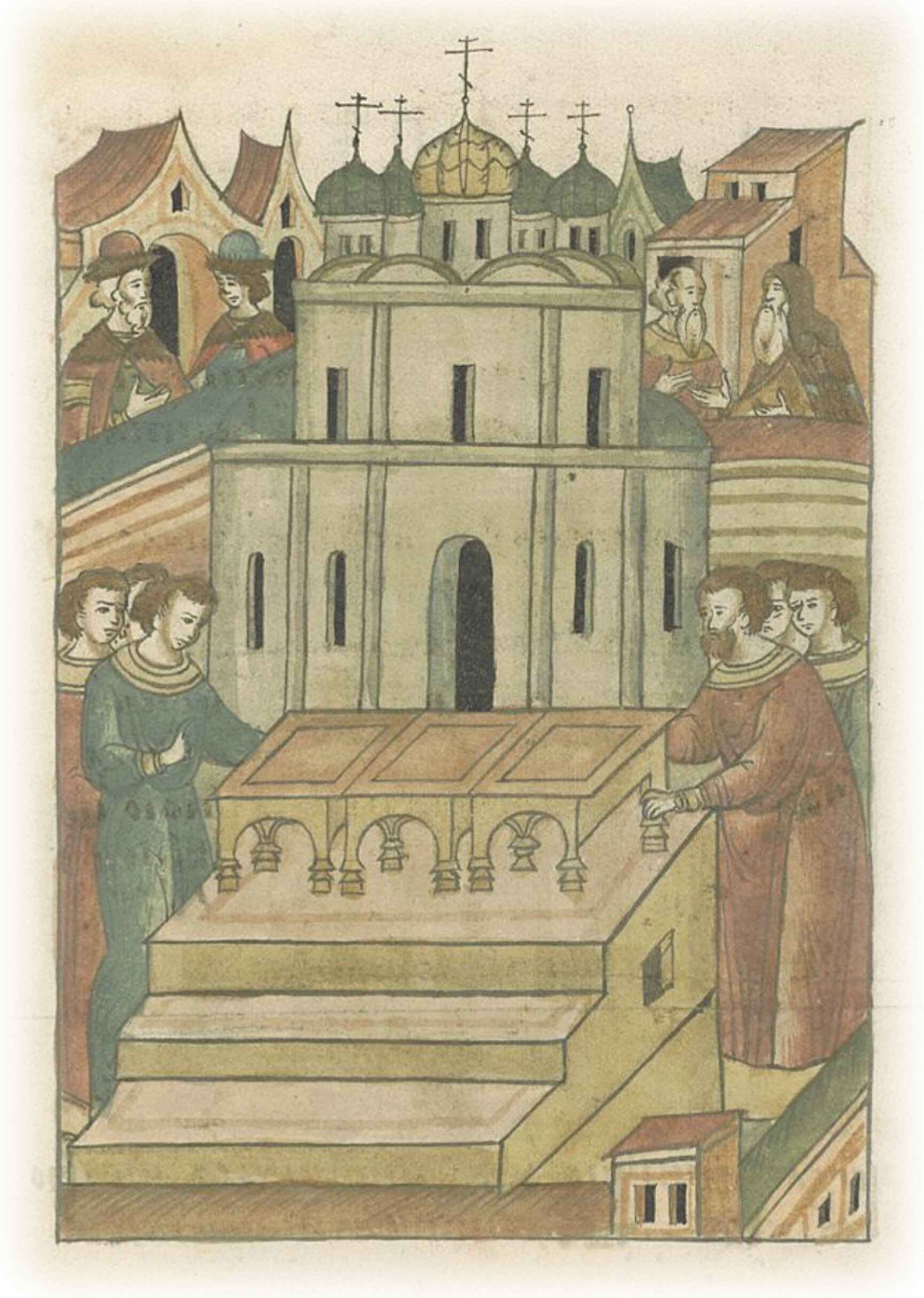 О поставлении внука на великое княжение. Посреди церкви приготовили особый помост, на котором ставят святителей, и поставили на том помосте три кресла: великому князю Ивану, его внуку Дмитрию и митрополиту.