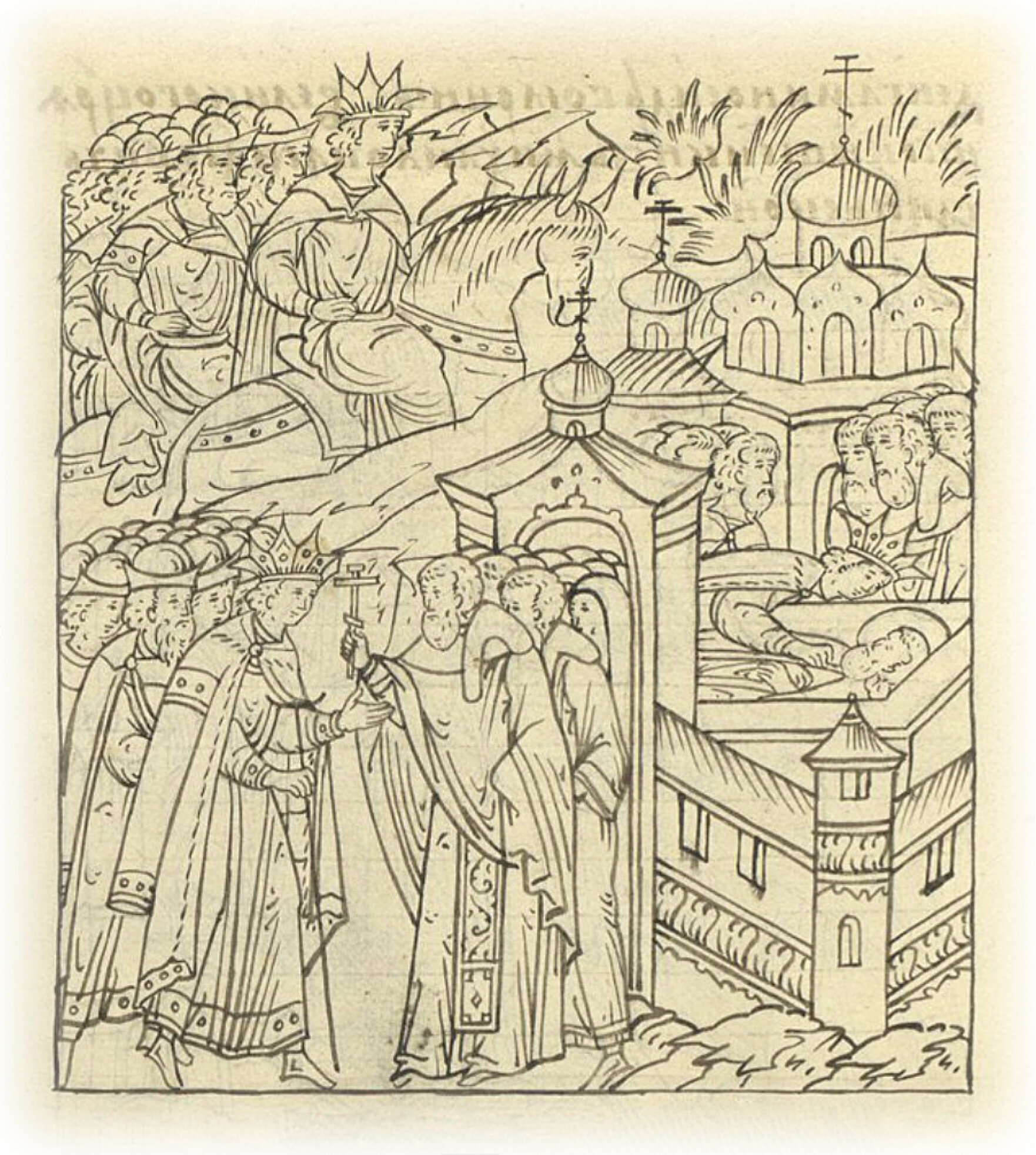 О царском поезде. В том же месяце в 25 день поехал царь и великий князь Иван Васильевич всея Руси к Живоначальной Троице в Сергиев монастырь помолиться и к мощам чудотворца Сергия приложиться, и молебное пение послушать, игумену и всем старцам великой обители повелел Бога молить о своем здравии, о милости Божьей и об укреплении его царства;