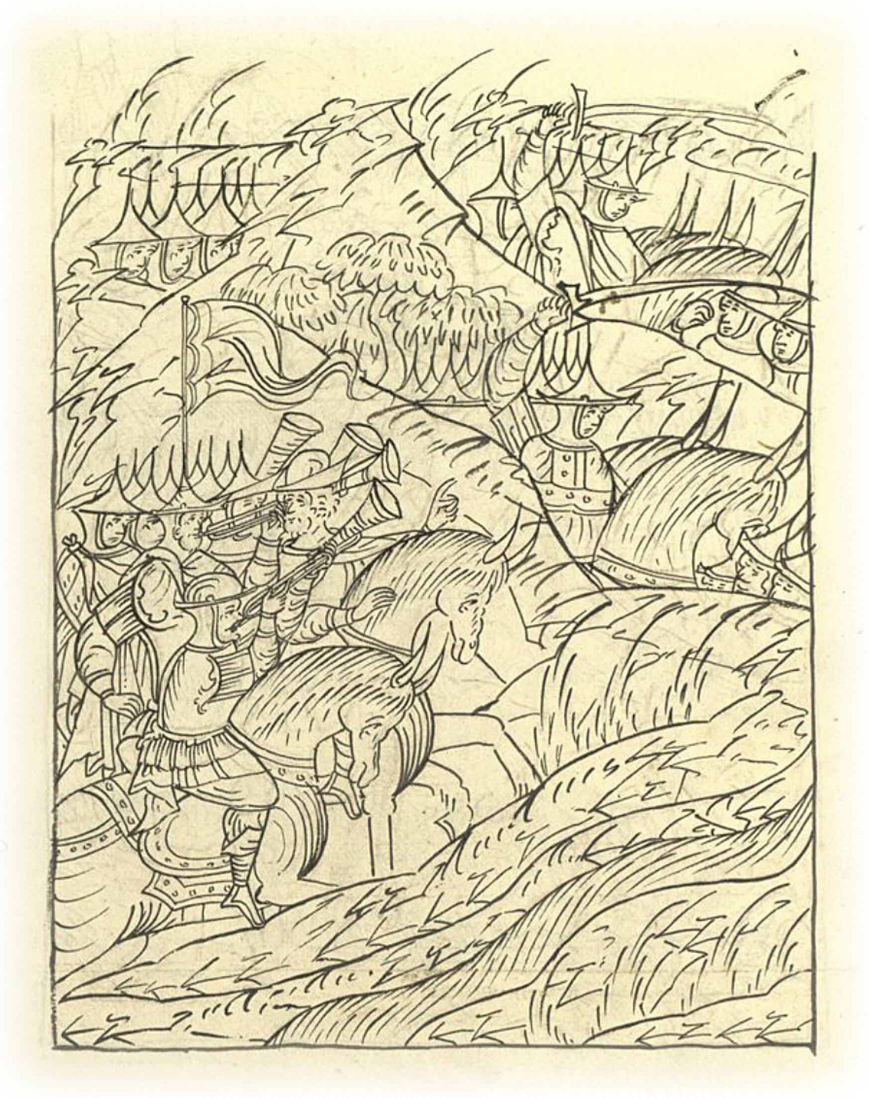 И встал боярин князь Александр Борисович с товарищами на Килир-речке и велел трубить и созывать ратных, во все стороны разошедшихся на многие версты.