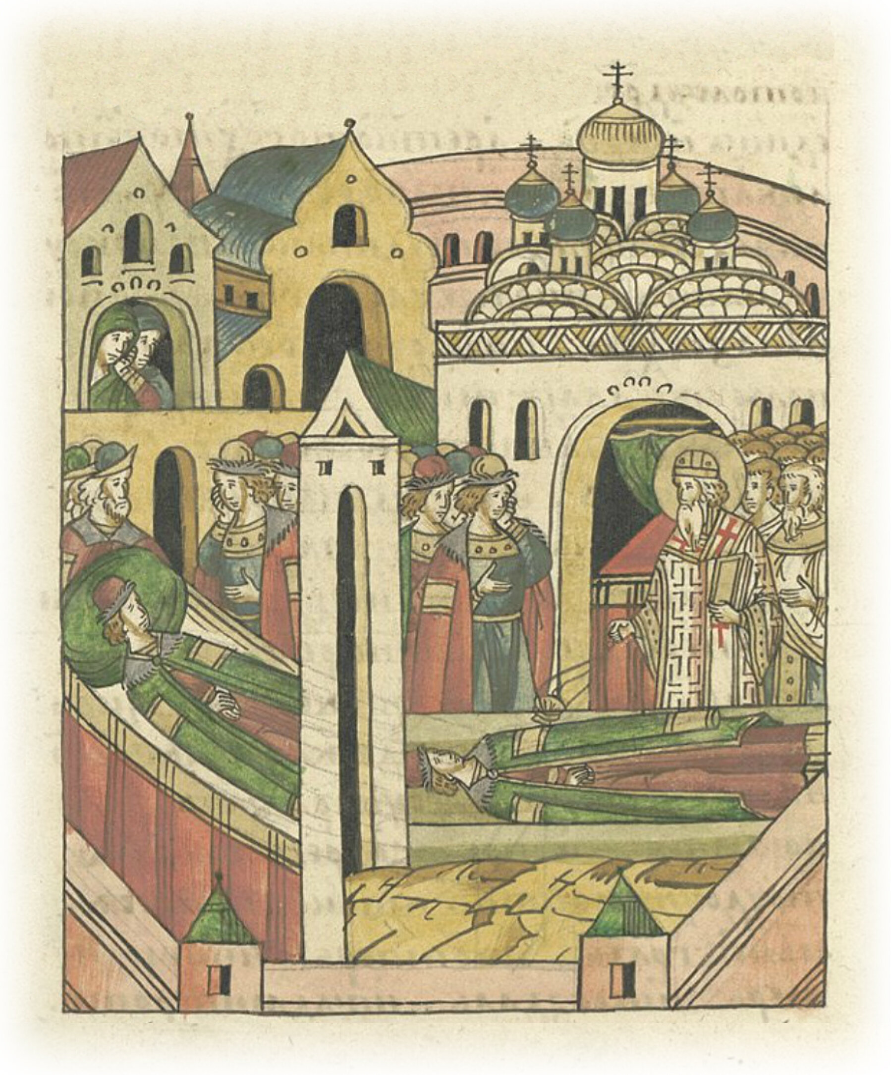 Кончина князя Ивана Ивановича Малого и его похороны в Москве в церкви святого архангела Михаила.