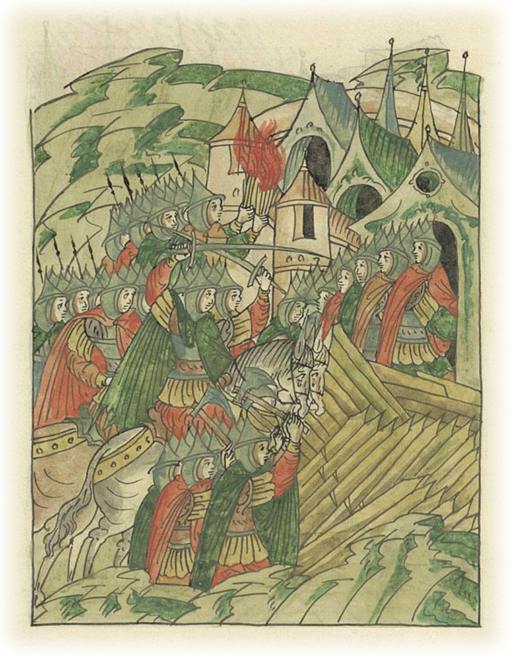 О войне против болгар. Войско Святослава Всеволодовича зажигает город с другой стороны и гонит болгар в город.