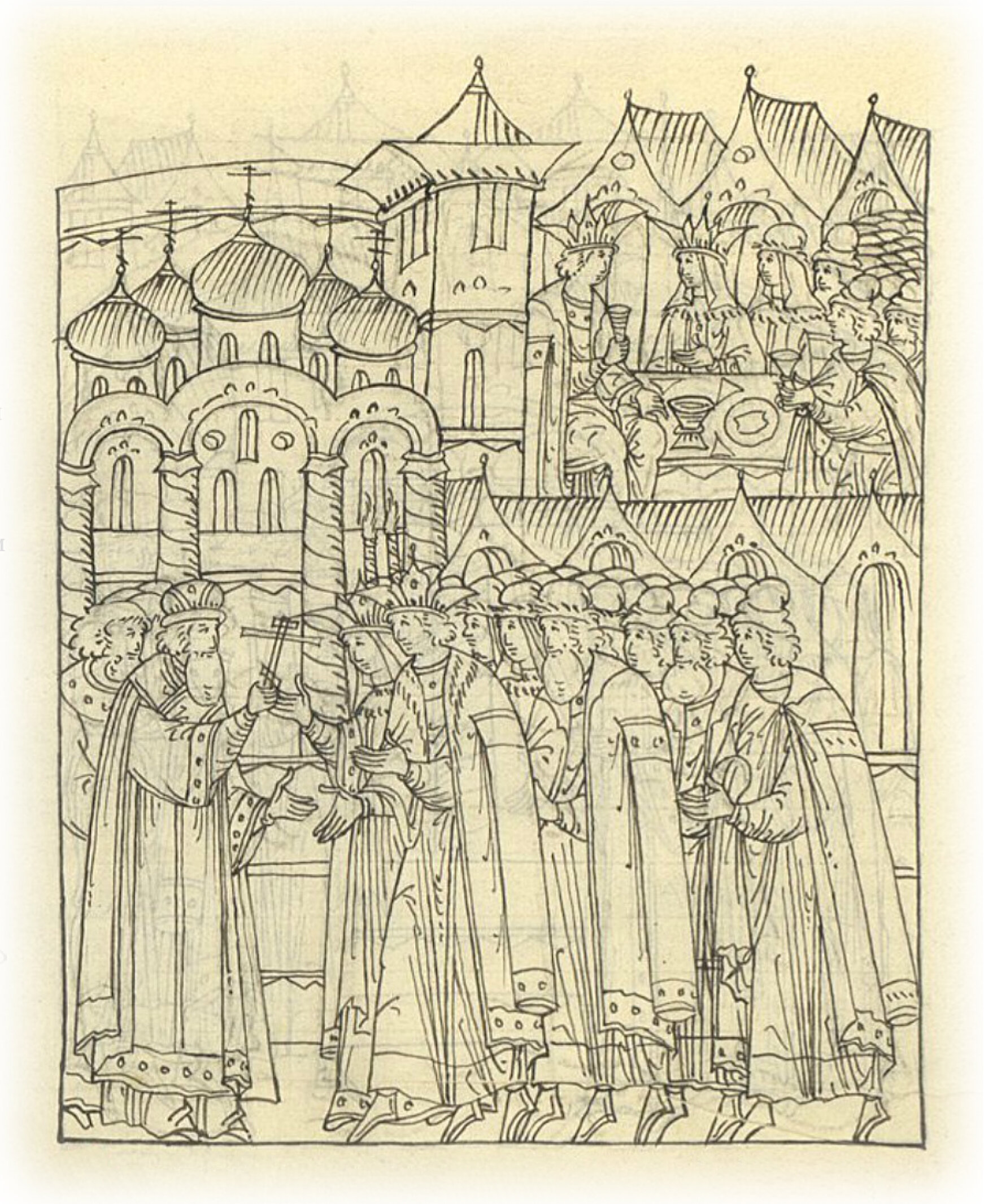 И женился русский царь и великий государь месяца февраля в 3 (день), в четверг на Всеедной* неделе, и венчал их в соборной церкви Пречистой Владычицы нашей Богородицы и Приснодевы Марии Честного и Славного Ее Успения митрополит всея Руси Макарий в царствующем городе Москве; и была большая радость о браке государя. * Неделя, в среду и пятницу которой разрешается скоромная пища.