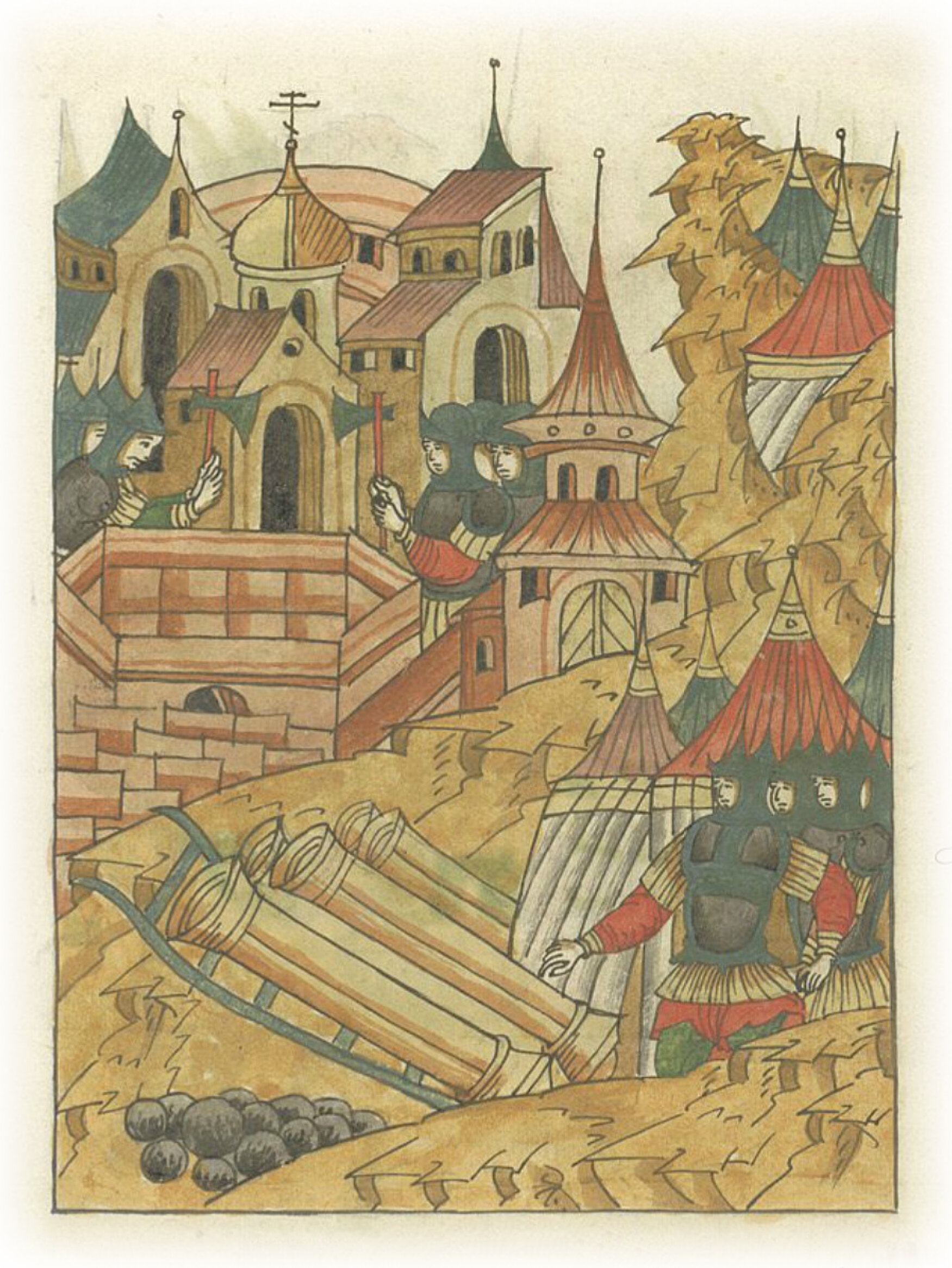 Языки говорят воеводам царя Ивана Васильевича, что магистр окопался большим рвом вокруг города Рындола, бьет из пушек и пищалей и приступает к Рындолу.