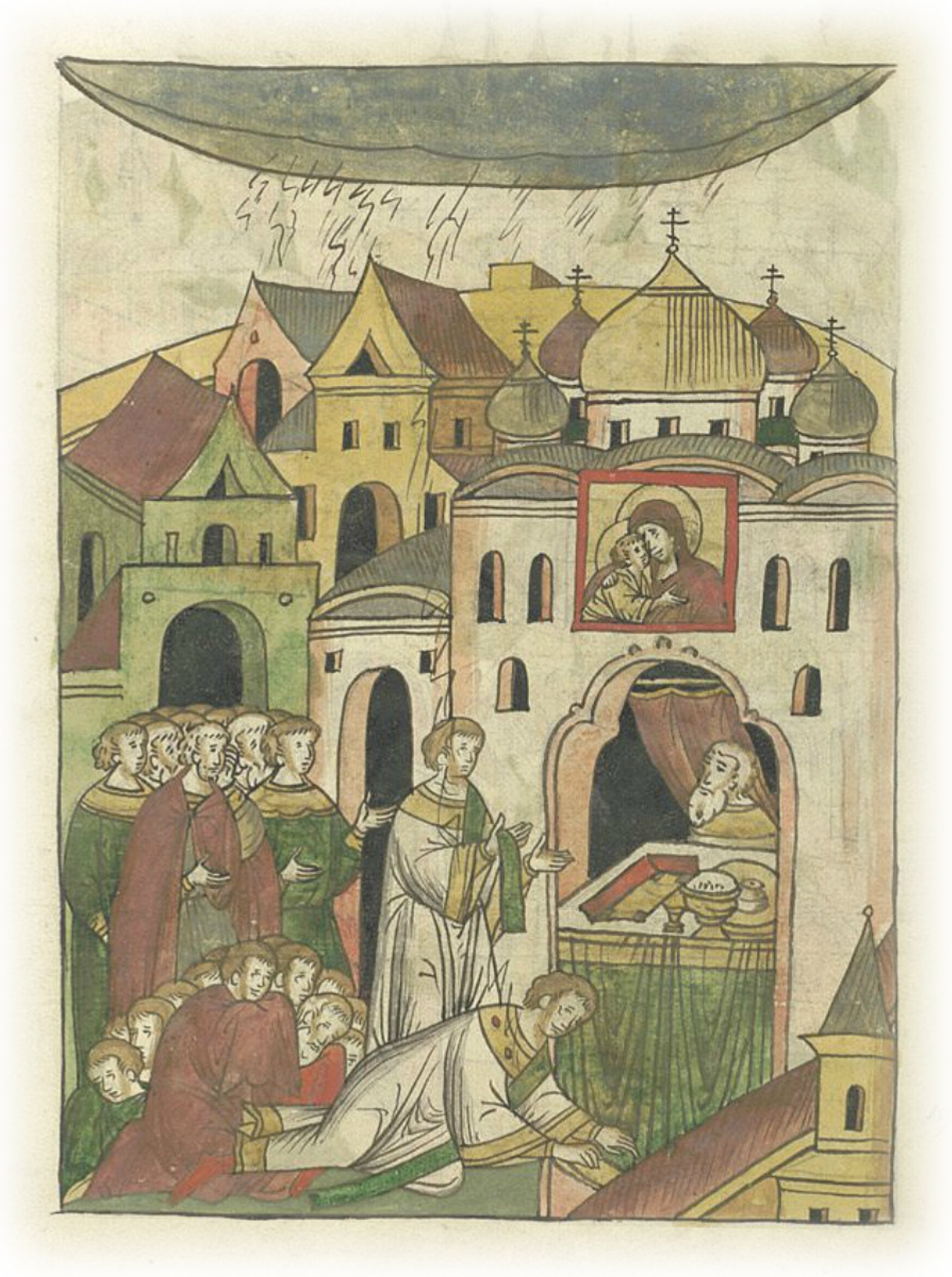 В том же году был гром страшный в городе Владимире, и поразил диакона в святой церкви соборной Пречистой Богородицы, на обедне, на выходе, ектенью глаголющего; и люди все пали ниц от многого страха, и были словно мертвые.
